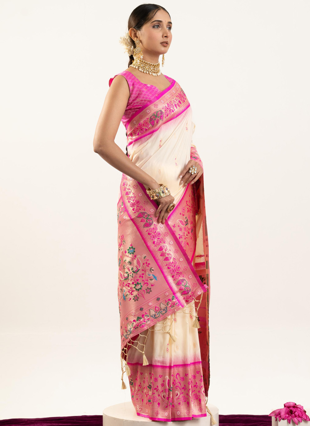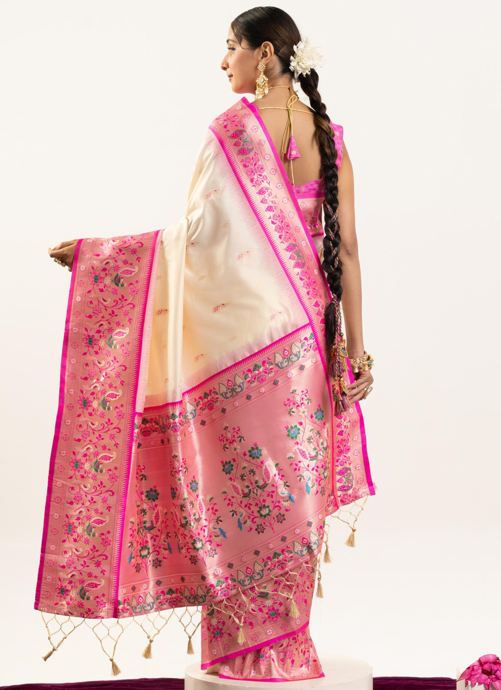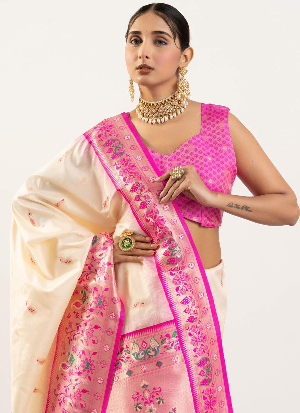 Shop the elegant Banarasi Silk Cream Zari Weaving Classic Saree designed with luxurious silk and delicate zari work. Its soft cream shade and traditional weaving make it perfect for ceremonial and festive occasions. Comes with matching blouse.