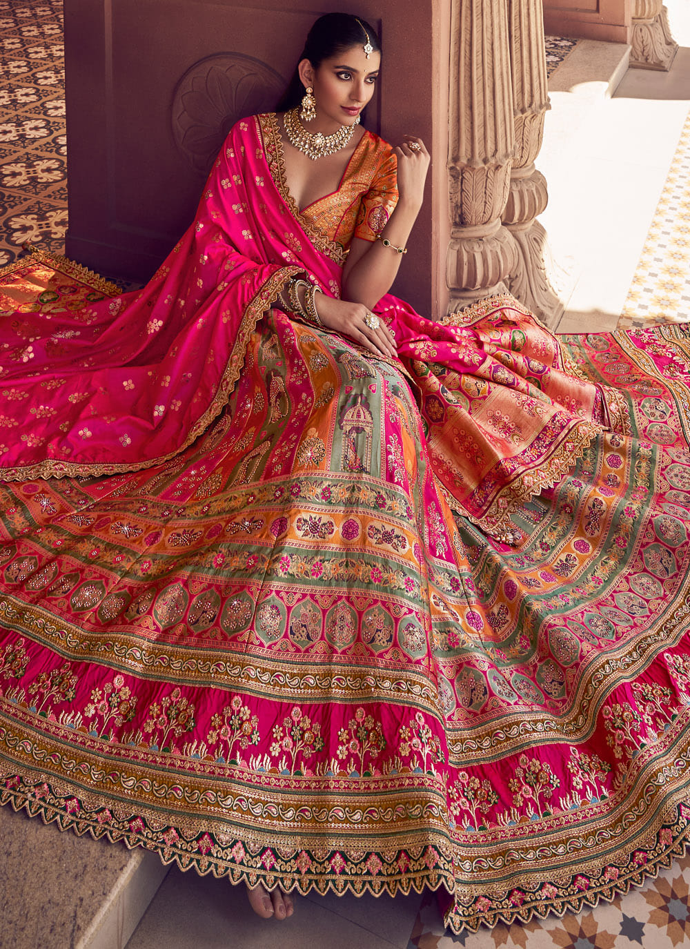 This Banarasi silk designer lehenga choli reflects timeless luxury with its rich silk texture and refined craftsmanship. Designed to enhance festive and wedding looks, the fabric carries a royal sheen that adds elegance to every movement. Comes with matching choli and dupatta.