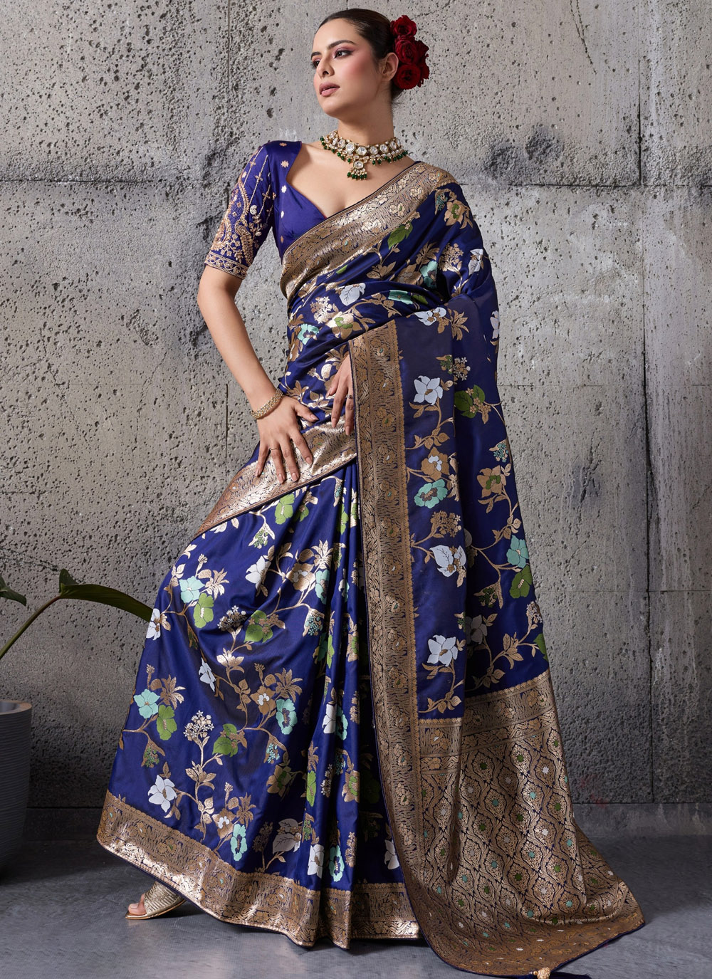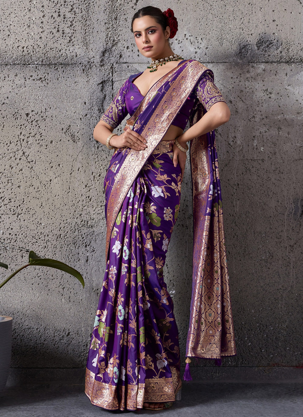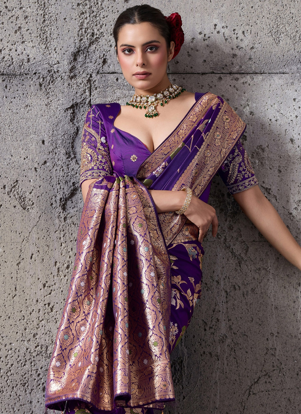 Designed for modern women, this Banarasi silk weaving and embroidered purple contemporary saree reflects elegance and tradition. The fine craftsmanship and premium silk fabric create a stunning and comfortable outfit. Comes with matching blouse.