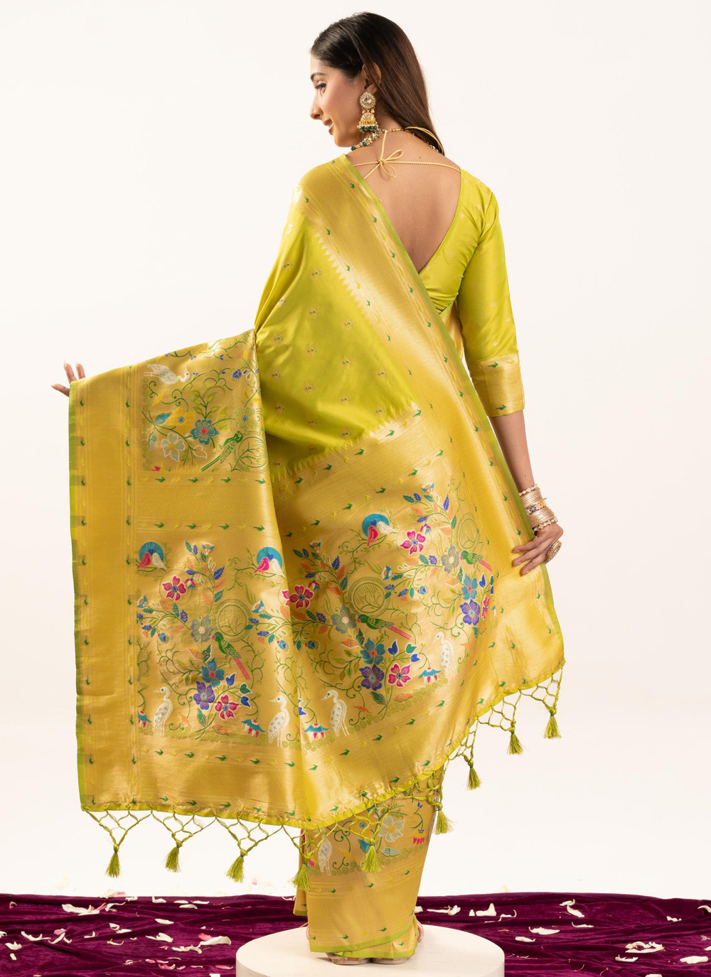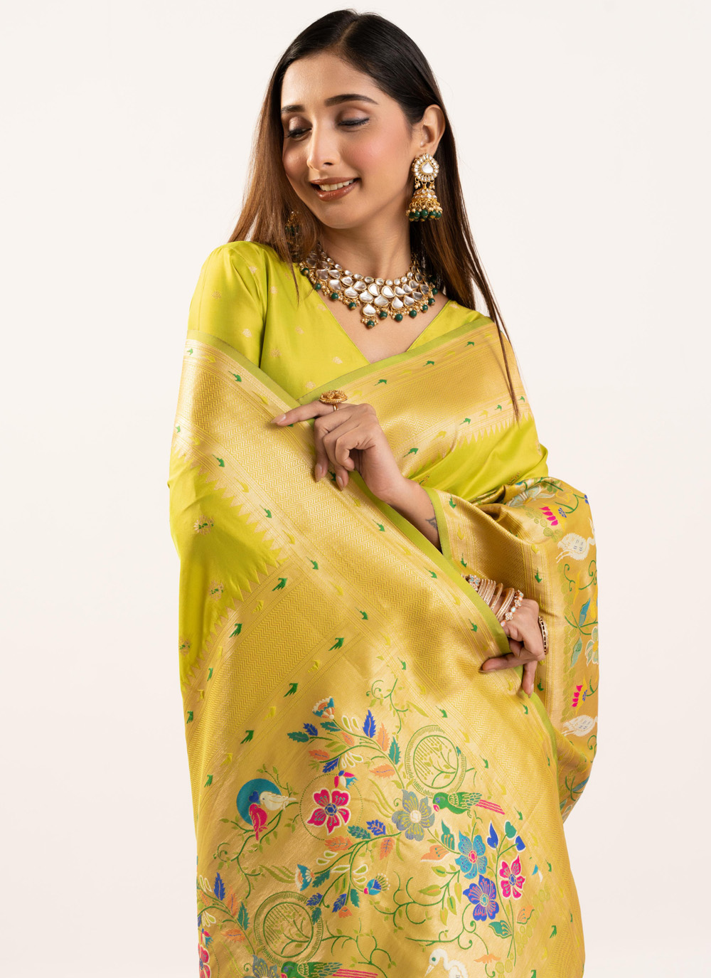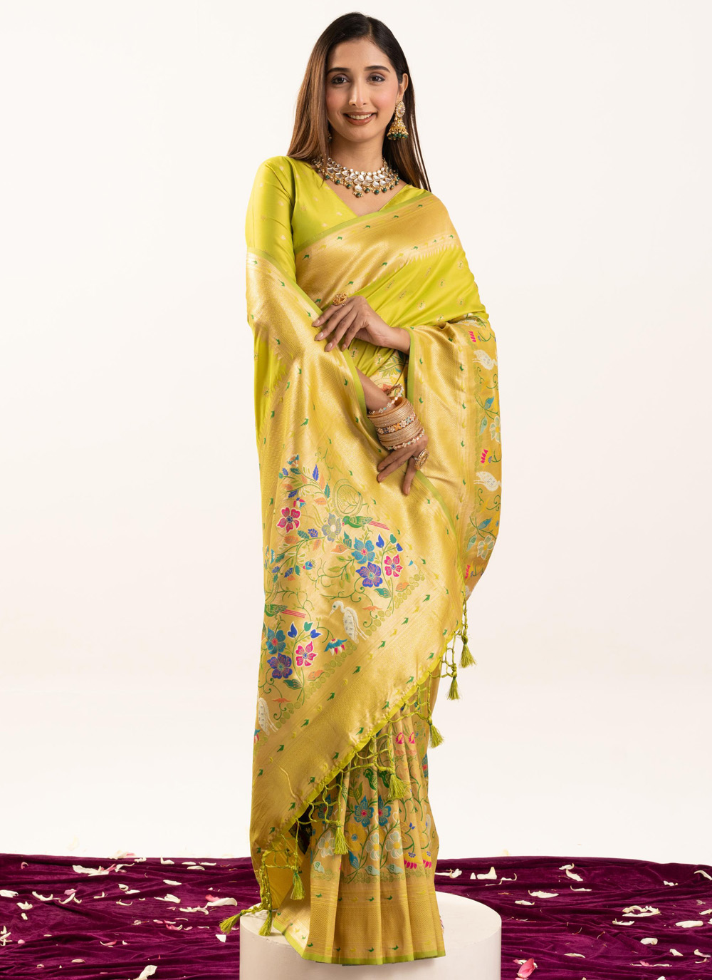 Celebrate timeless elegance with this Banarasi Silk Green Zari Weaving Traditional Saree. The rich green shade beautifully highlights the intricate zari weaving, creating a graceful and classic ethnic look. Comes with matching blouse.