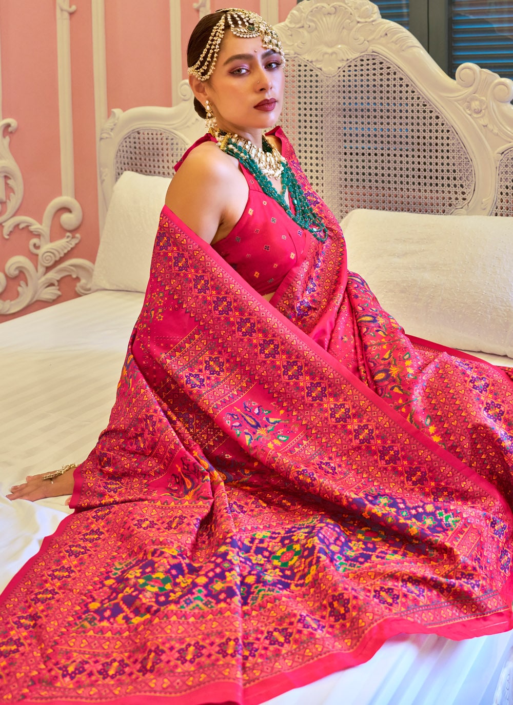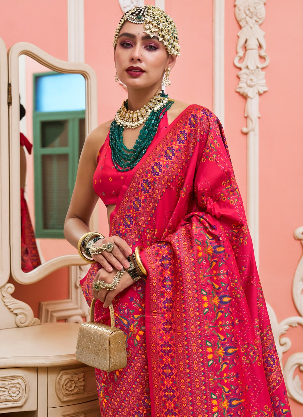 This elegant pink designer saree celebrates the charm of Banarasi weaving through vibrant Meenakari detailing and traditional motifs. The silk fabric flows delicately, adding a regal touch to every movement. Comes with matching blouse.