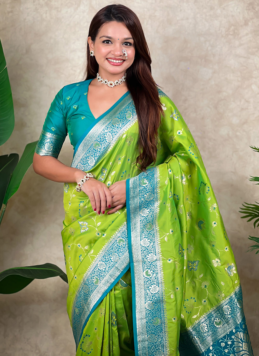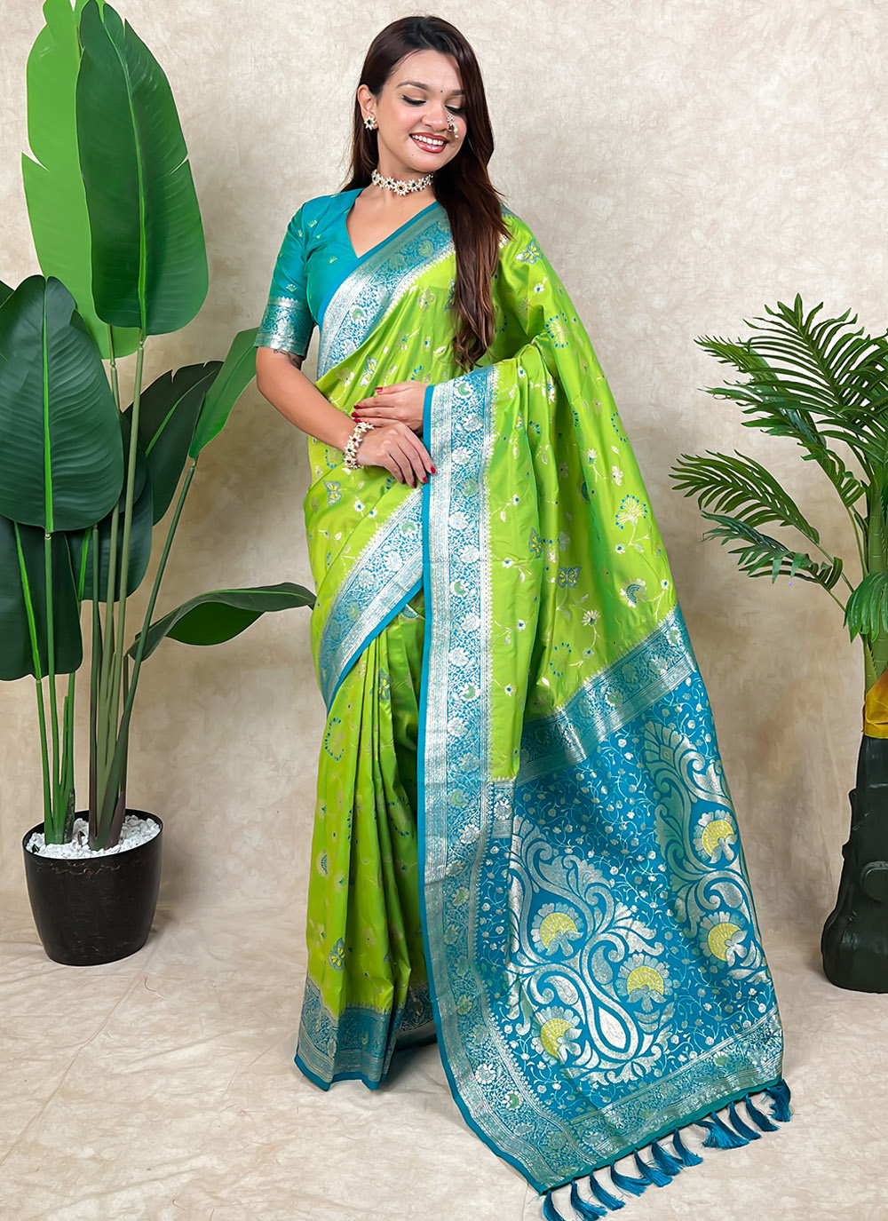 Celebrate tradition in style with this green Banarasi silk saree showcasing intricate meenakari artistry and classic zari weaving. The rich color and smooth finish add charm to ceremonial and cultural events. Comes with matching blouse.