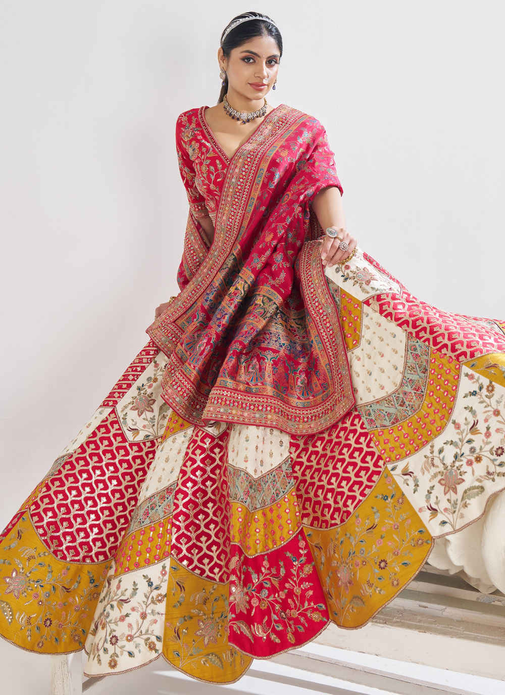 Designed for the bride who deserves nothing less than royal, this Banarasi Silk Bridal Lehenga features multi-color richness with a blend of detailed zari, sparkling sequins, and stone work. The heavy weave and traditional craftsmanship make it ideal for classic wedding themes with a glamorous twist. Comes with matching choli and dupatta.