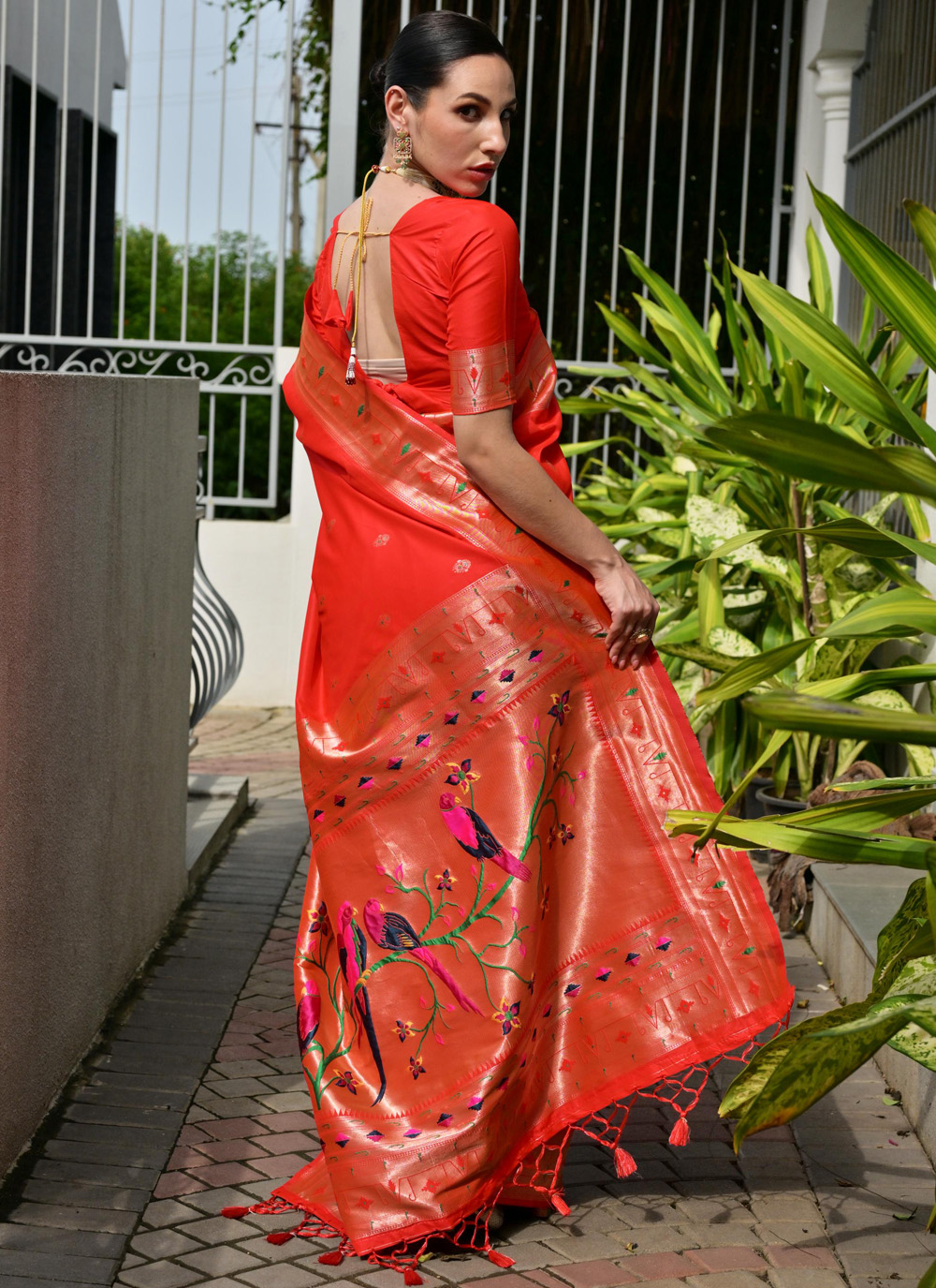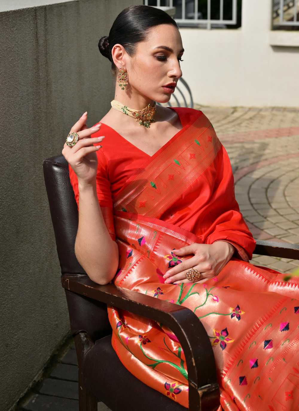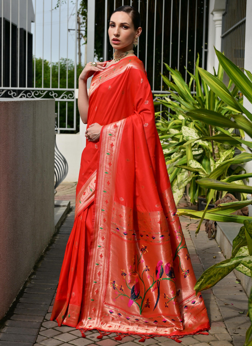 This designer orange Banarasi silk saree showcases timeless craftsmanship through its fine zari and meenakari weaving. Its rich texture and bold colour make it ideal for celebrations and ceremonial wear. Comes with matching blouse.