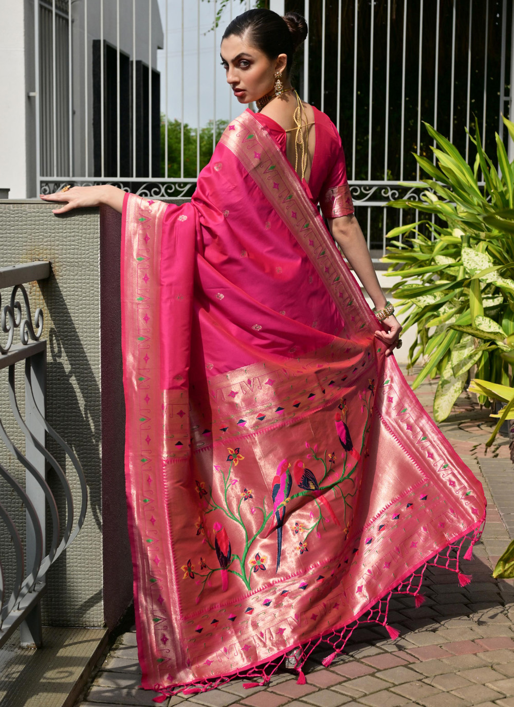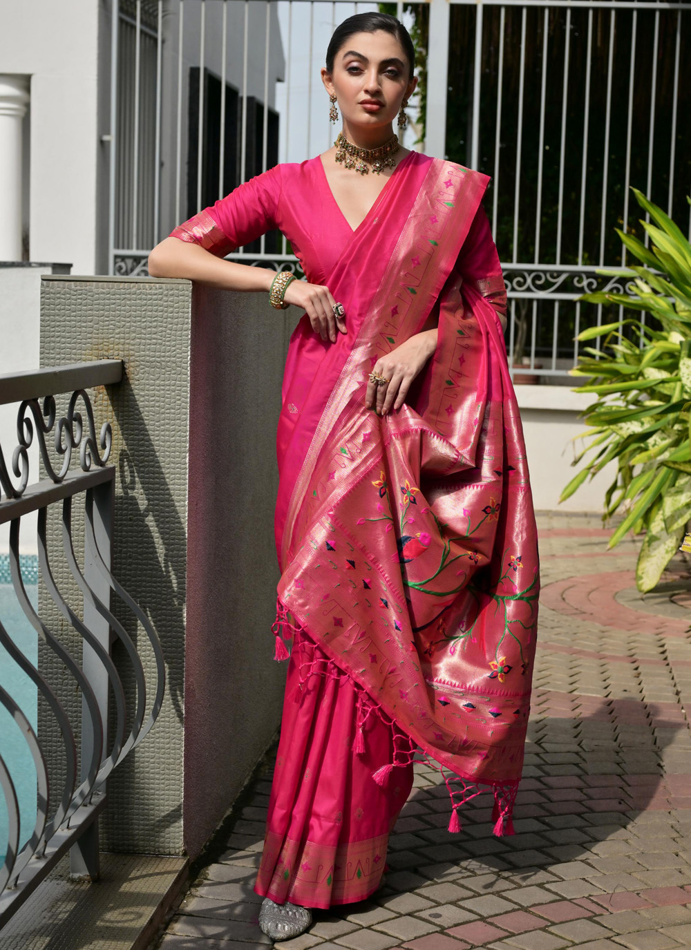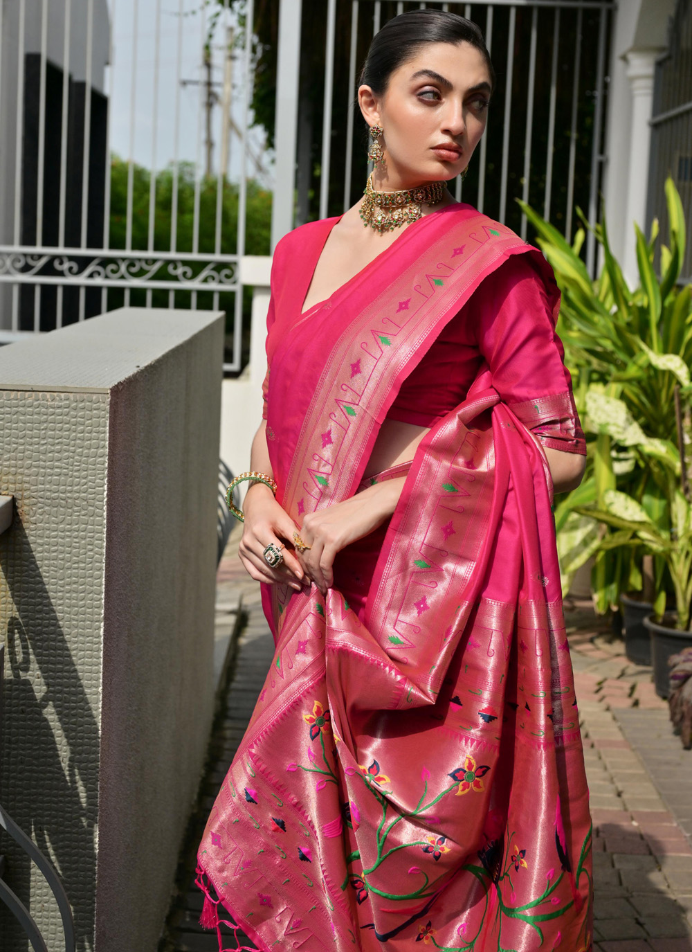 Add a stylish traditional touch to your ethnic wardrobe with this pink Banarasi silk saree. The refined meenakari zari woven design offers a perfect balance of classic elegance and contemporary appeal. Comes with matching blouse.