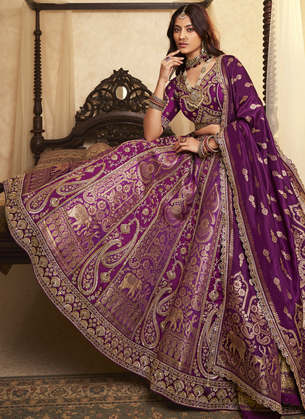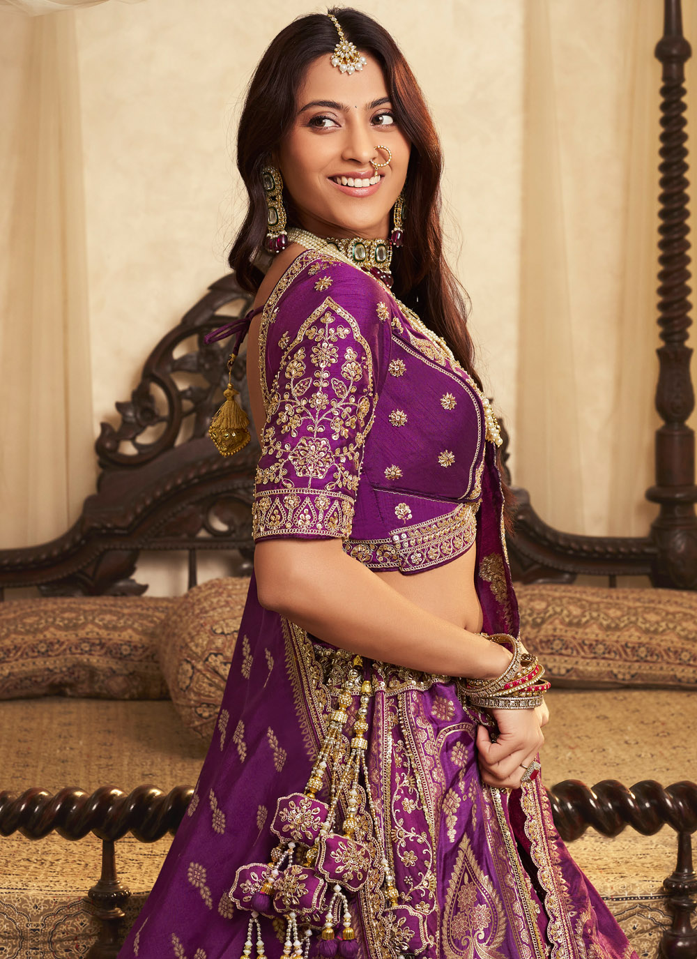 Make your engagement unforgettable with this Purple Banarasi Silk Lehenga Choli, featuring shimmering Swarovski crystals, sequins, stone embellishments, and intricate zari embroidery. The vibrant purple color adds a contemporary touch while maintaining traditional charm. Comes with matching choli and dupatta.