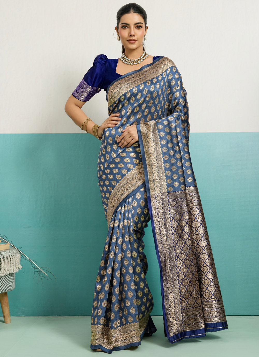 This traditional blue Banarasi silk saree features detailed zari woven craftsmanship that highlights authentic Indian artistry. The fine silk fabric provides natural shine and exceptional comfort, ensuring a flawless drape. Comes with matching blouse.