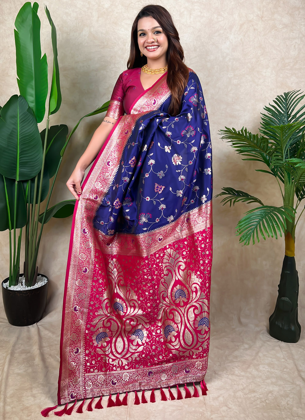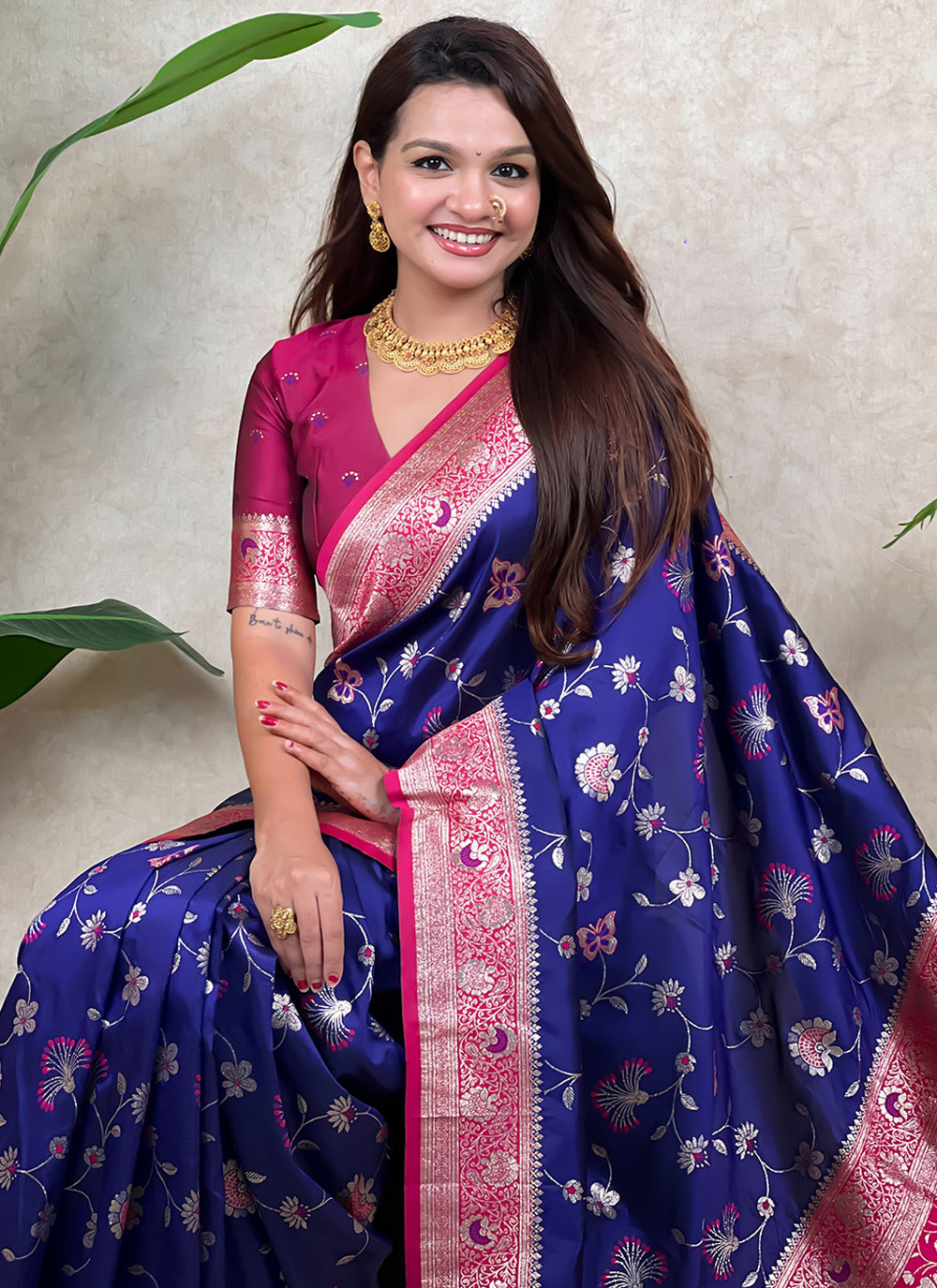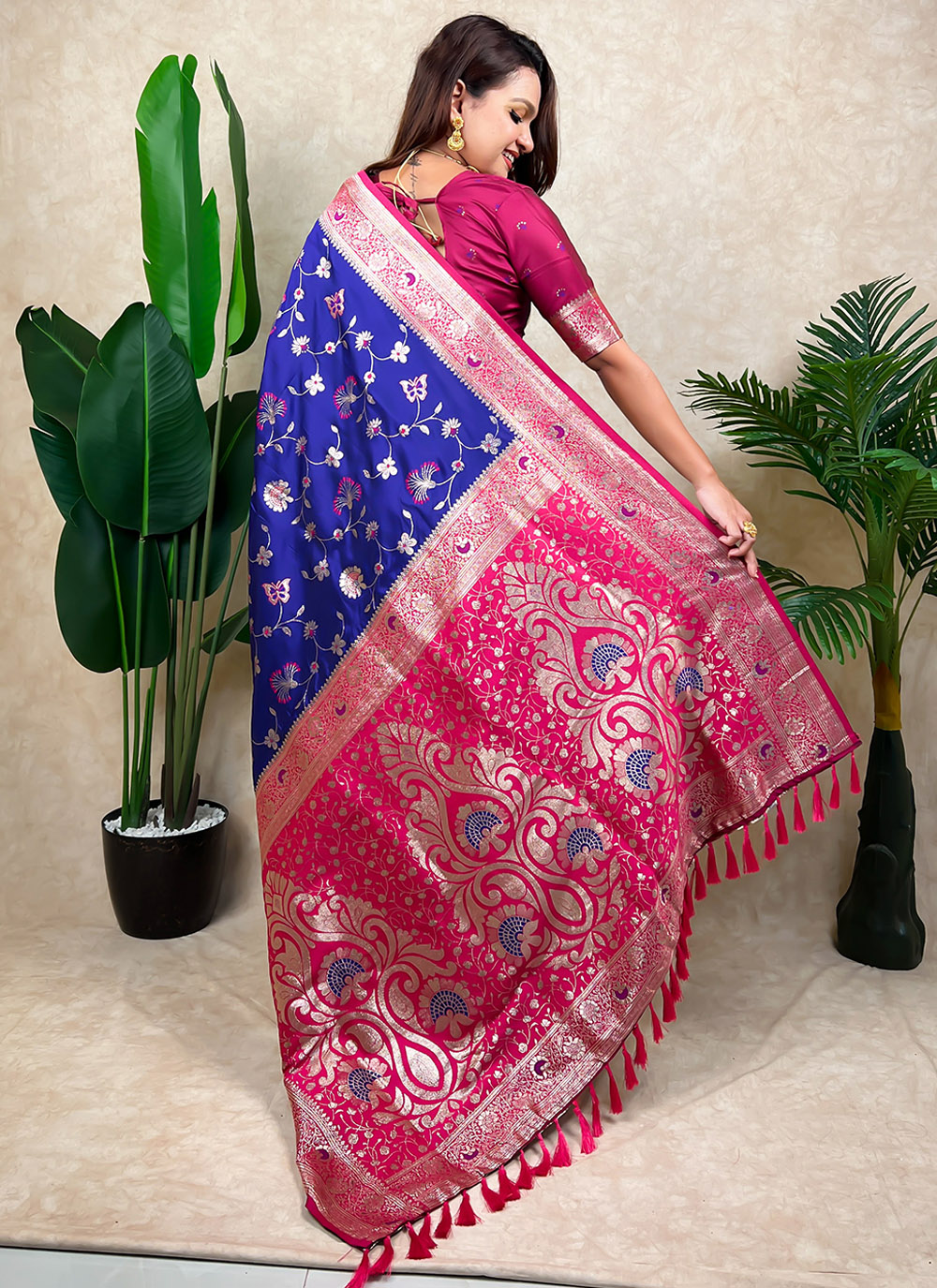 Designed for modern ethnic styling, this trendy violet Banarasi saree features detailed meenakari patterns woven with shimmering zari. Its graceful drape and royal color add charm to weddings and cultural events. Comes with matching blouse.