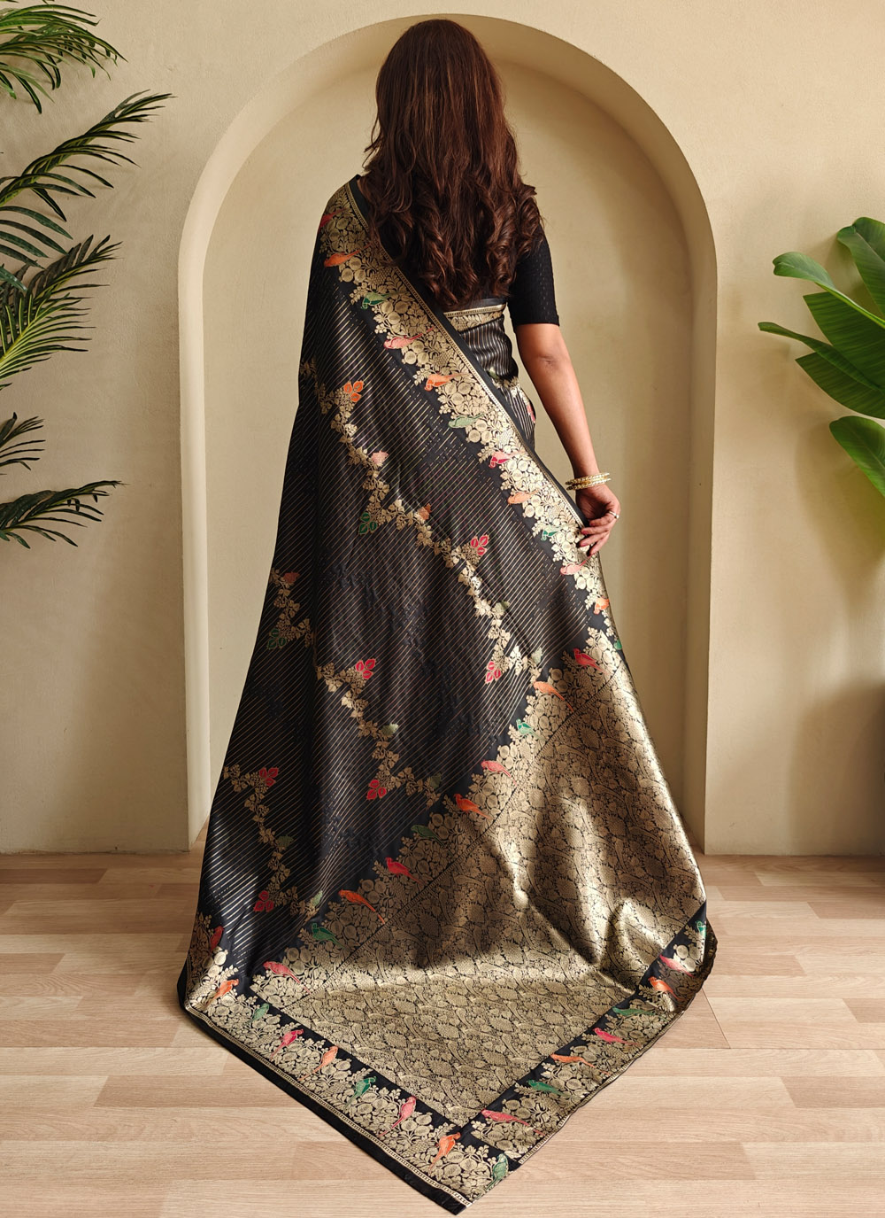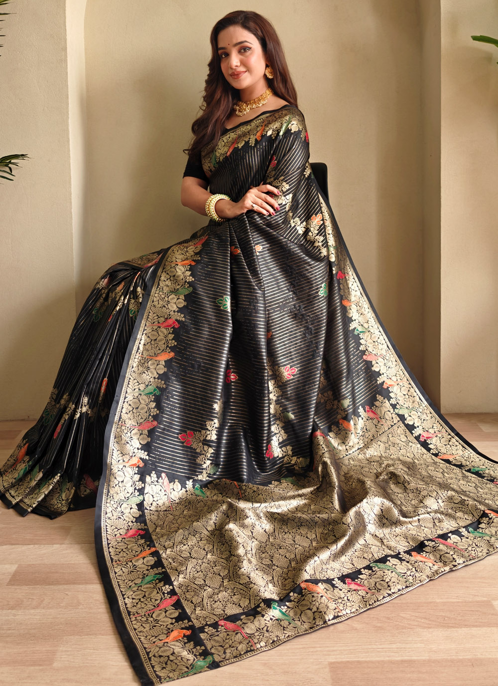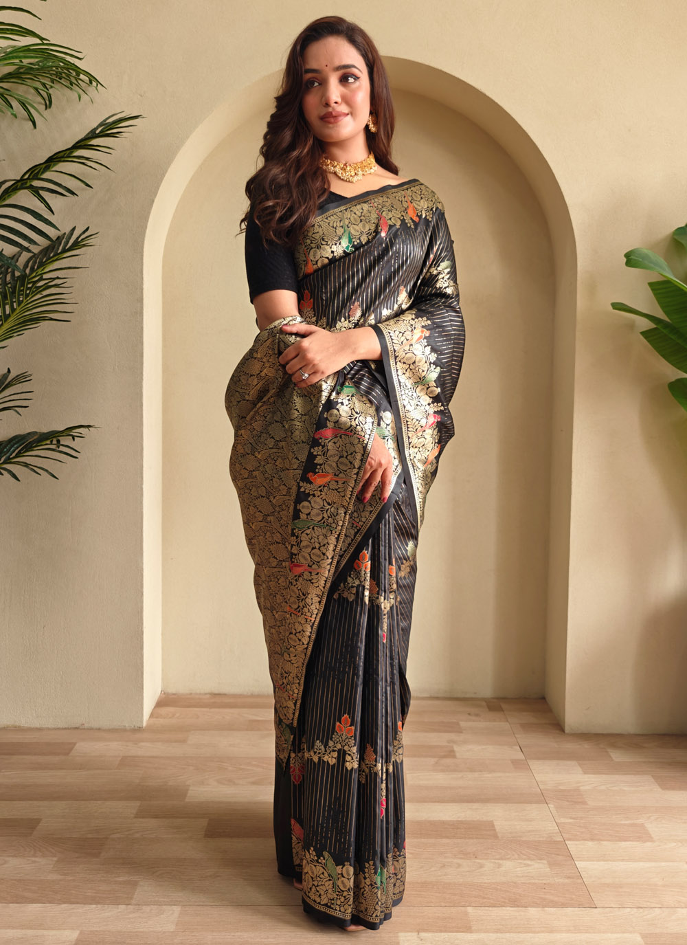 Grace your evening with timeless sophistication in this party-perfect black Banarasi saree, crafted from rich satin silk and detailed with golden zari woven motifs. Pair it with a stylish blouse and heels to complete the show-stopping look. Comes with matching blouse.
