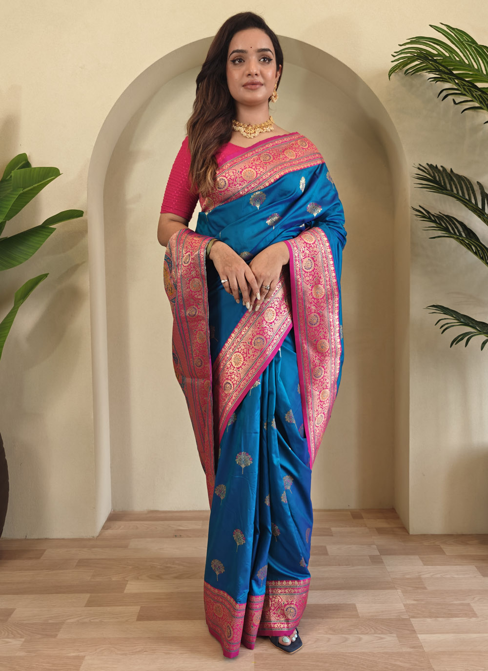 This ceremonial Banarasi saree in a rich blue hue is woven with delicate patterns that reflect regal sophistication. A perfect match for weddings, pujas, and festive events. Comes with matching blouse.
