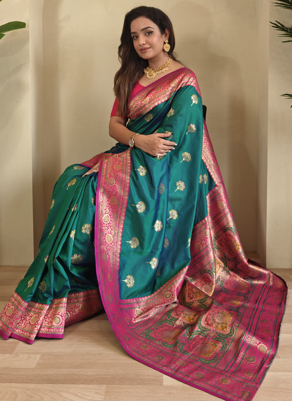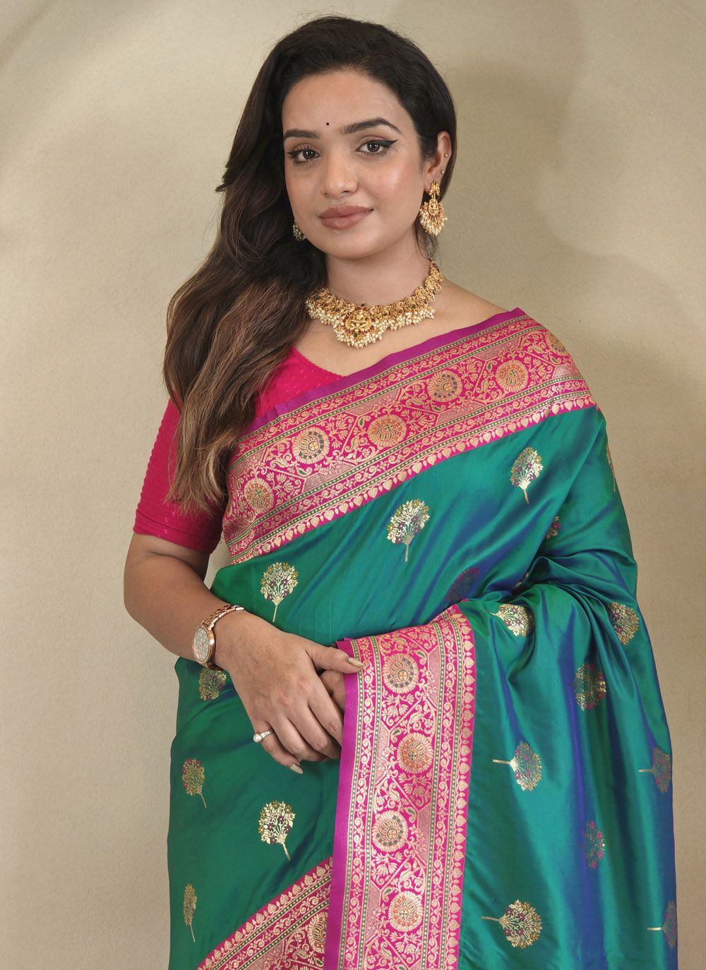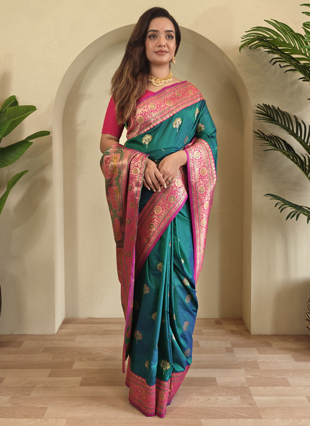 This contemporary Banarasi silk saree in a rich teal shade captures attention with its intricate weaving patterns. Lightweight yet grand, it transitions beautifully from day celebrations to evening elegance. Comes with matching blouse.