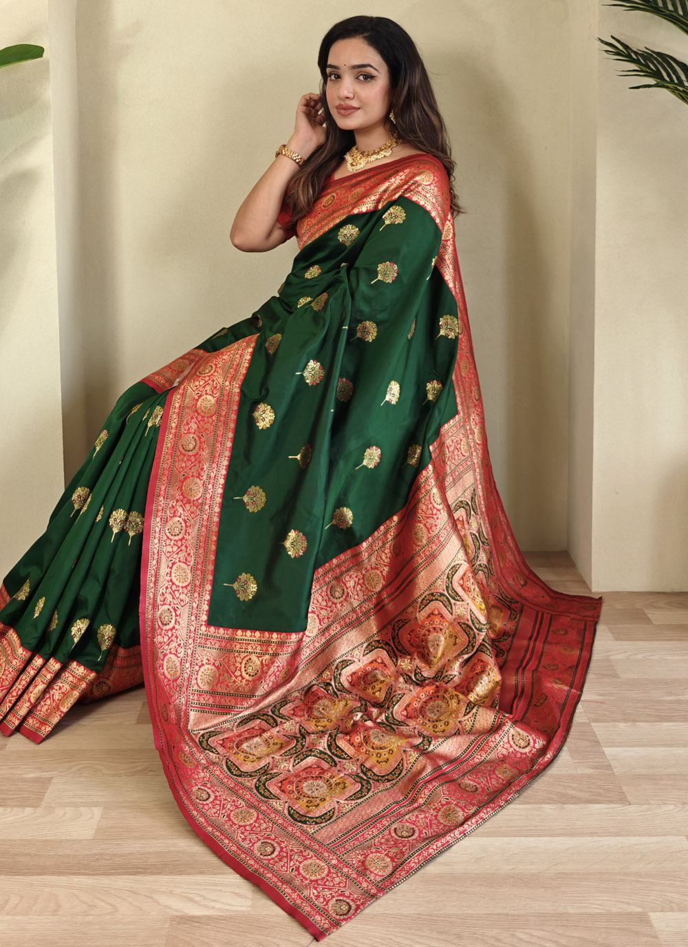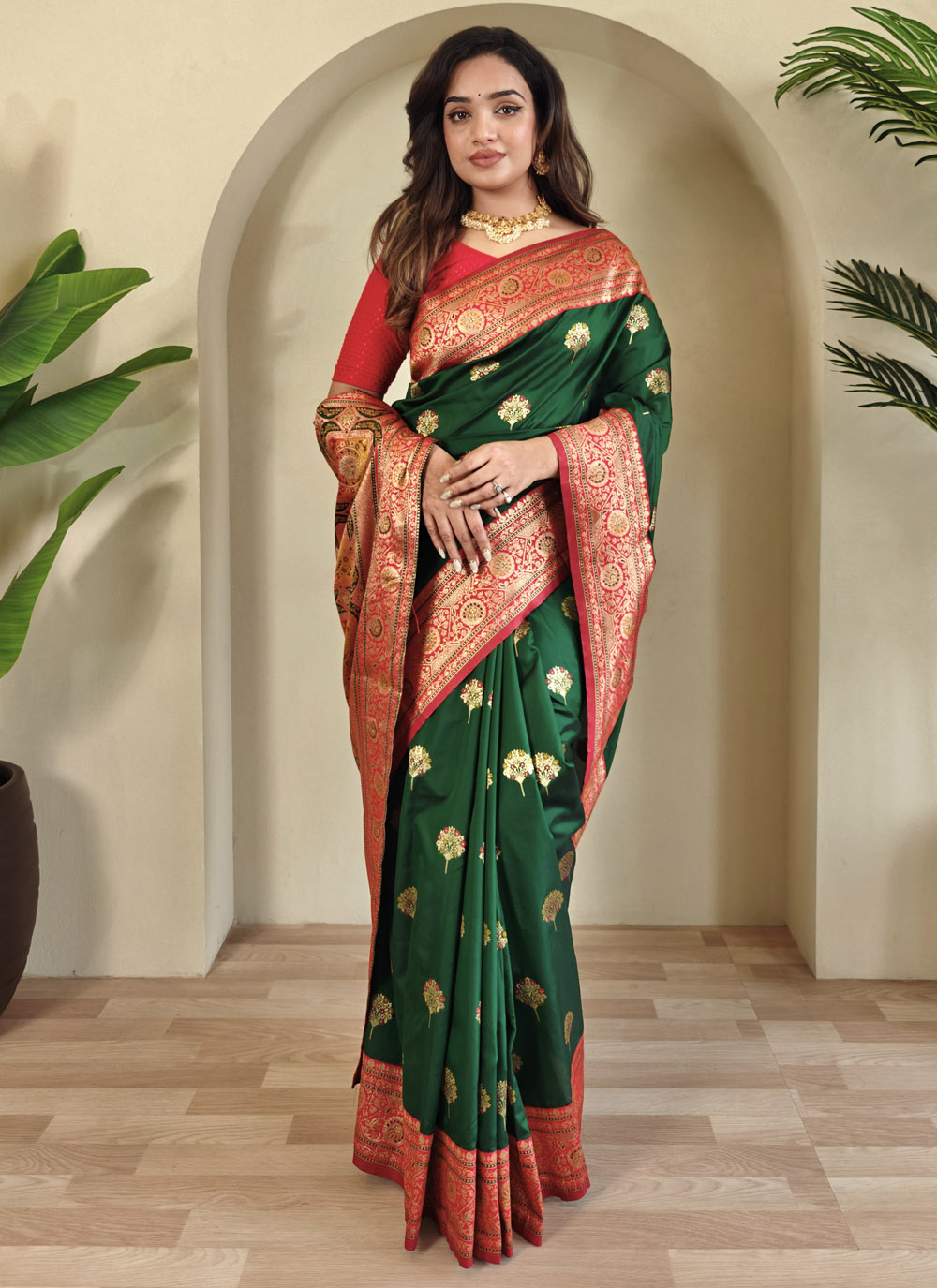 Drape yourself in tradition with this Banarasi Silk green saree, intricately woven with heritage patterns. Its rich silk texture and timeless green hue make it a perfect pick for weddings, festivals, and classic celebrations. Comes with matching blouse.