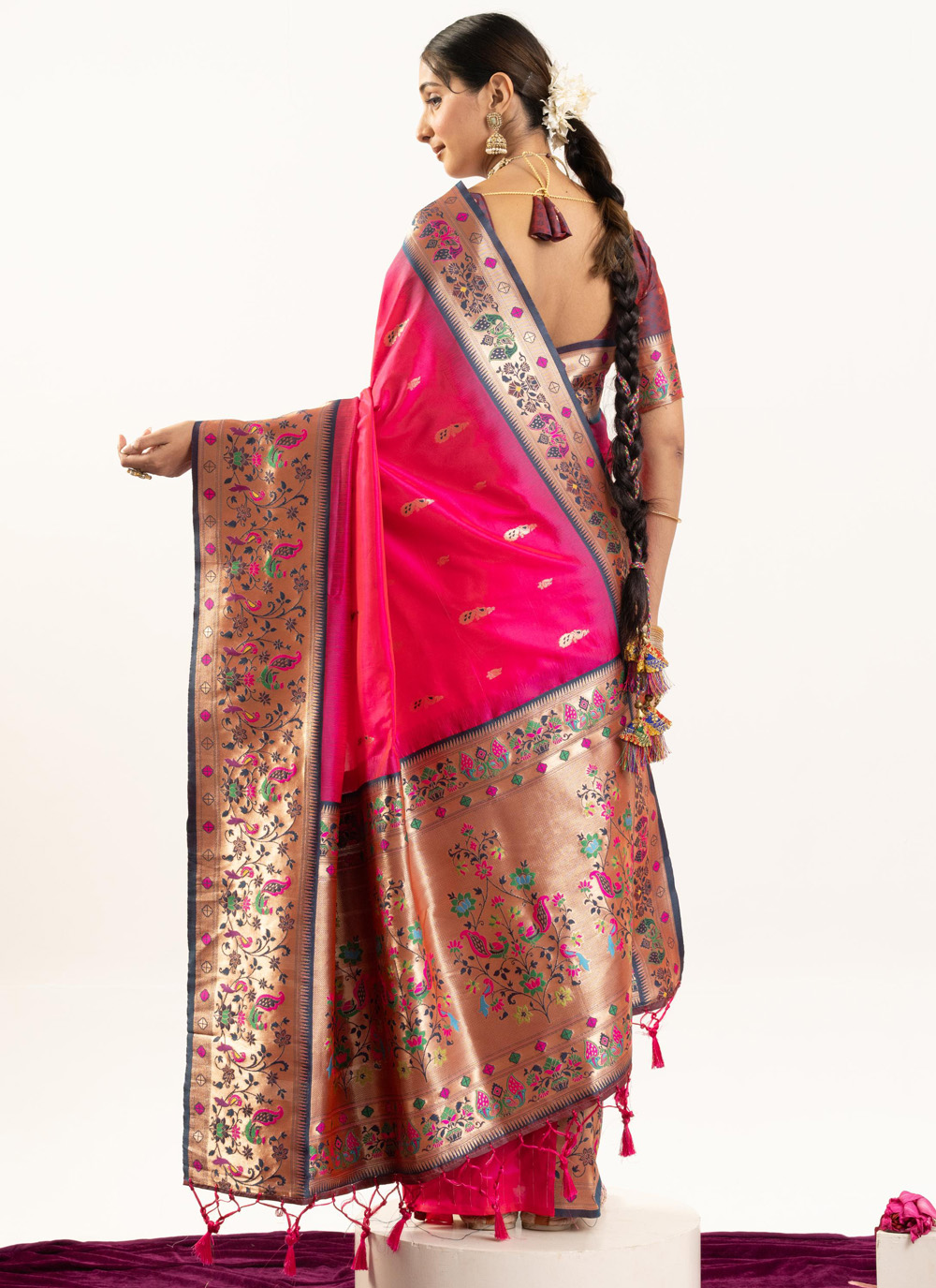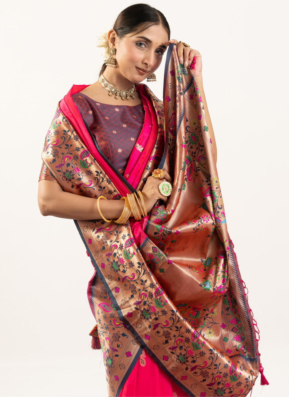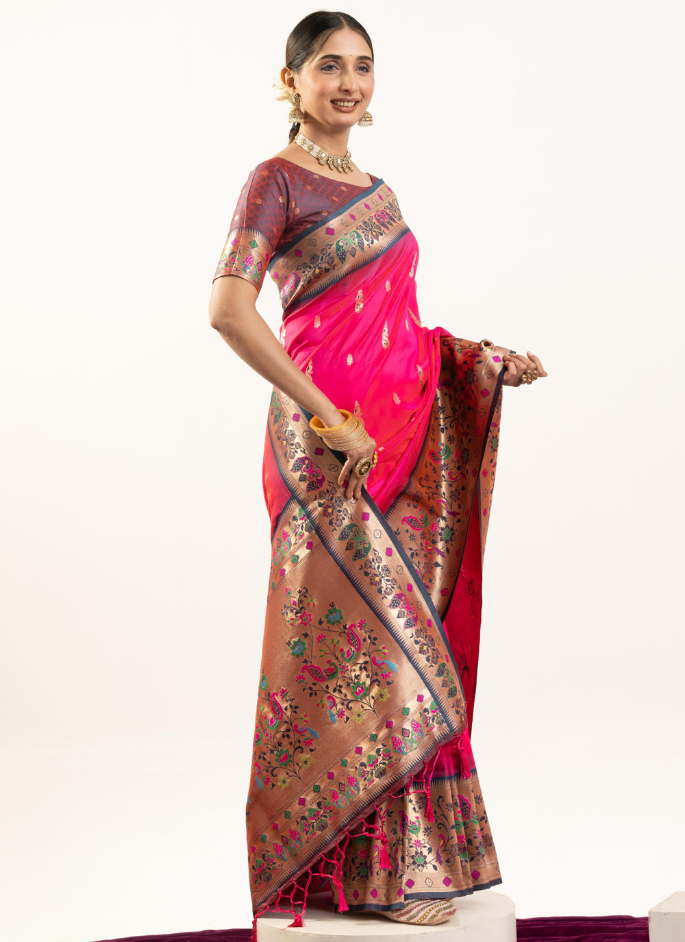 This contemporary Banarasi silk saree in a rich rani shade combines classic weaving techniques with a stylish look, offering a graceful outfit suitable for special events. Comes with matching blouse.