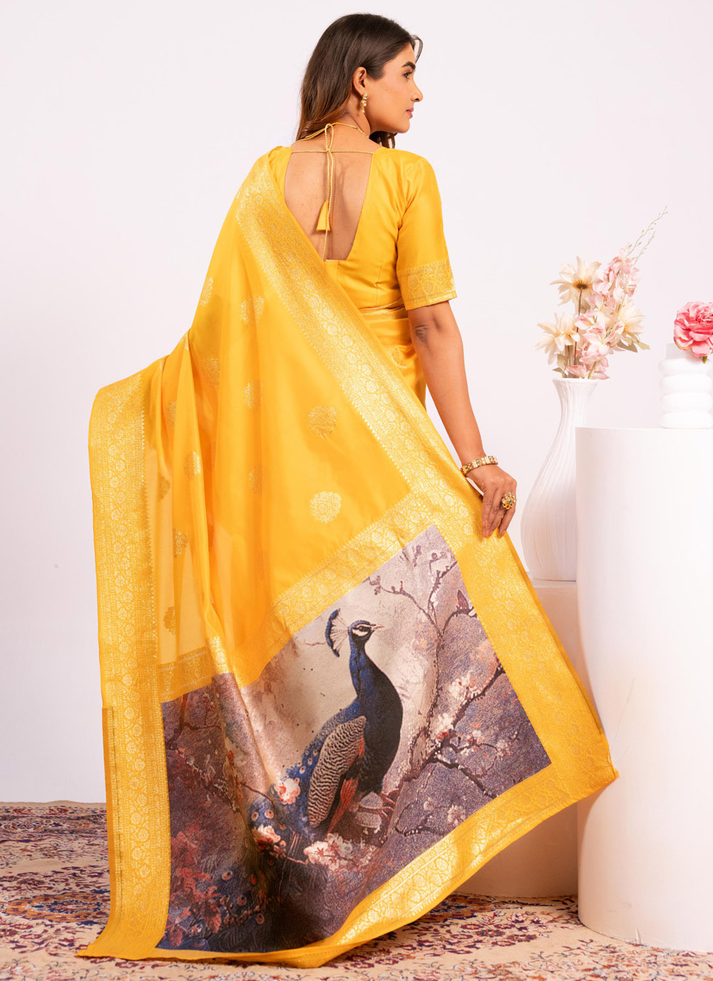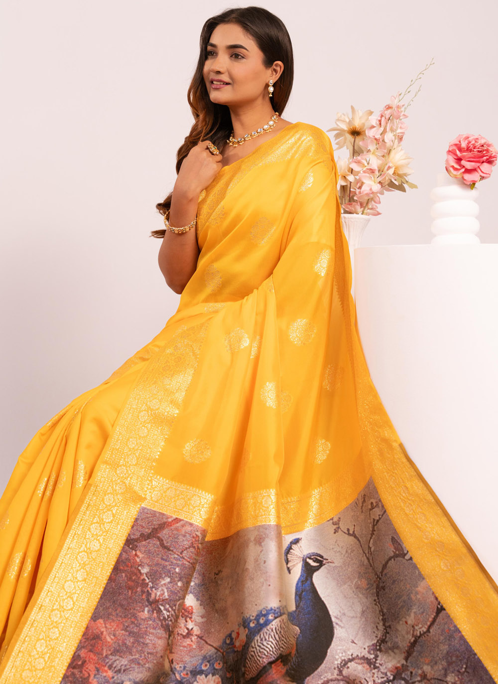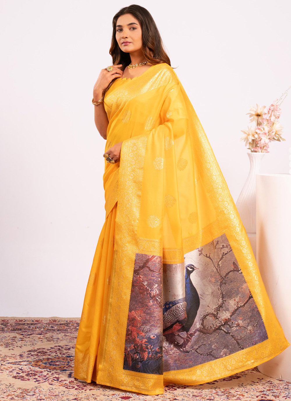 Crafted from premium Banarasi silk, this yellow saree features intricate resham weaving highlighted with classic zari detailing. Its designer appeal and vibrant tone make it a perfect choice for festive functions and traditional events. Comes with matching blouse.