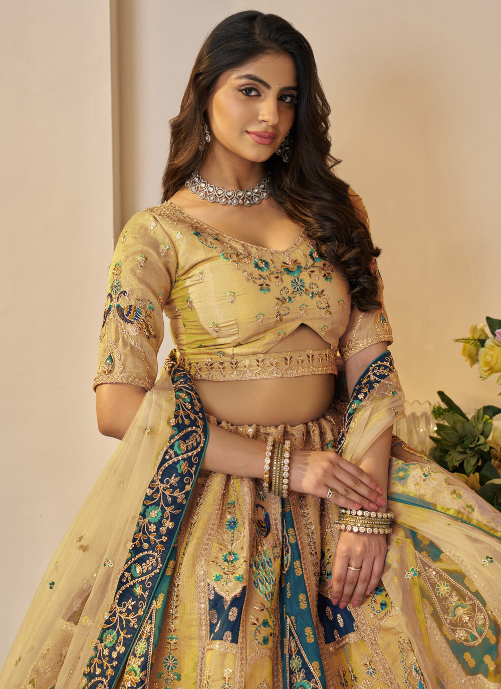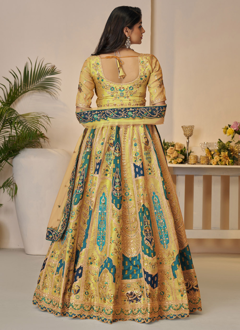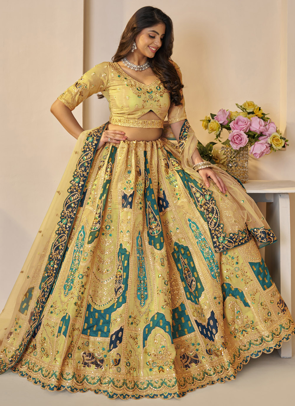 This Yellow Haldi Lehenga Choli is crafted in Banarasi silk, enhanced with shimmering sequins, intricate zari work, and fine stone embroidery. A festive blend of tradition and elegance, perfect for pre-wedding celebrations. Comes with matching choli and dupatta.