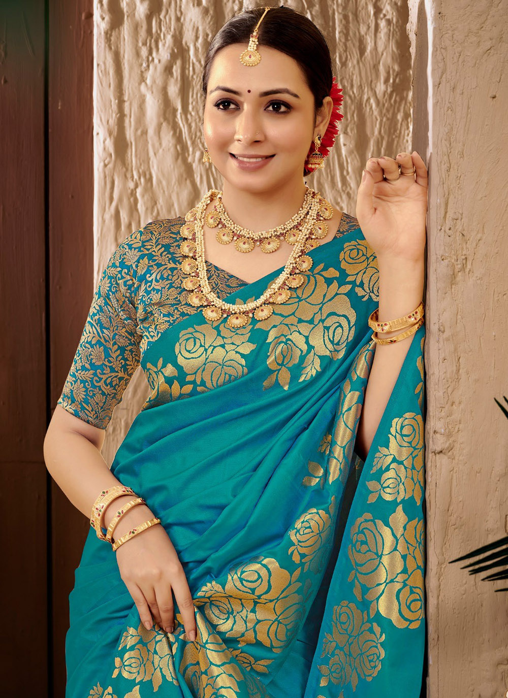 This aqua blue Banarasi silk saree combines traditional zari weaving with a modern color tone for a sophisticated look. The smooth silk fabric enhances comfort, while the delicate woven patterns elevate its overall beauty. Comes with matching blouse.