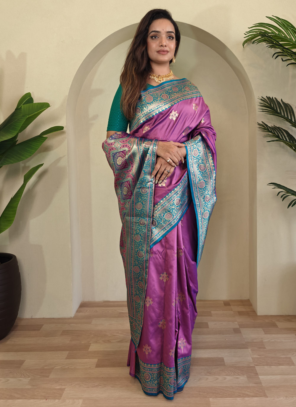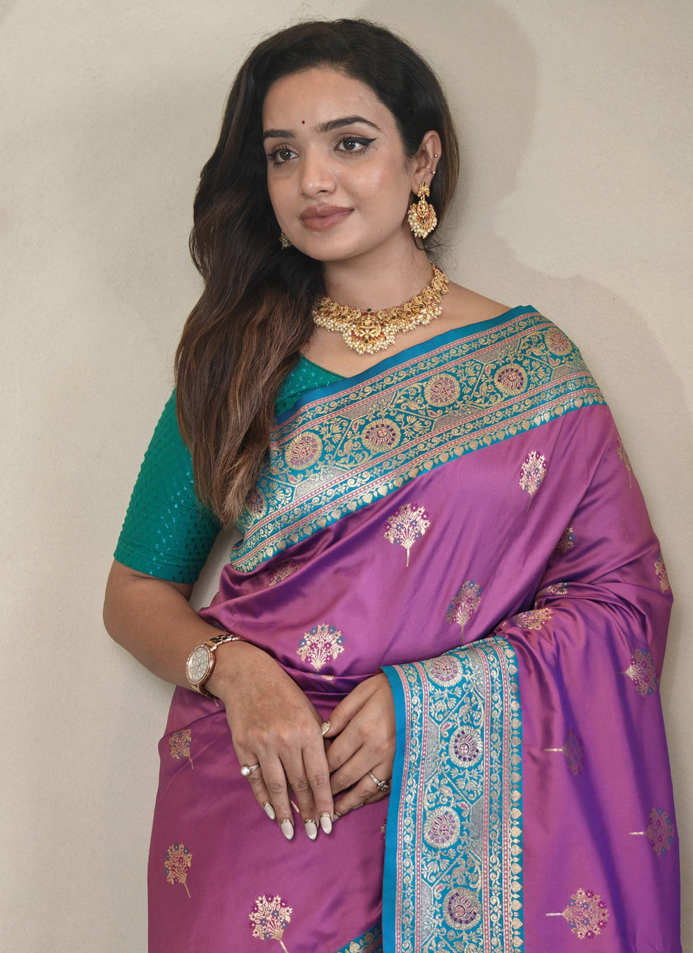 This purple Banarasi saree with rich zari detailing radiates vintage grace and sophistication, perfect for creating unforgettable memories at any ceremonial gathering. Comes with matching blouse.