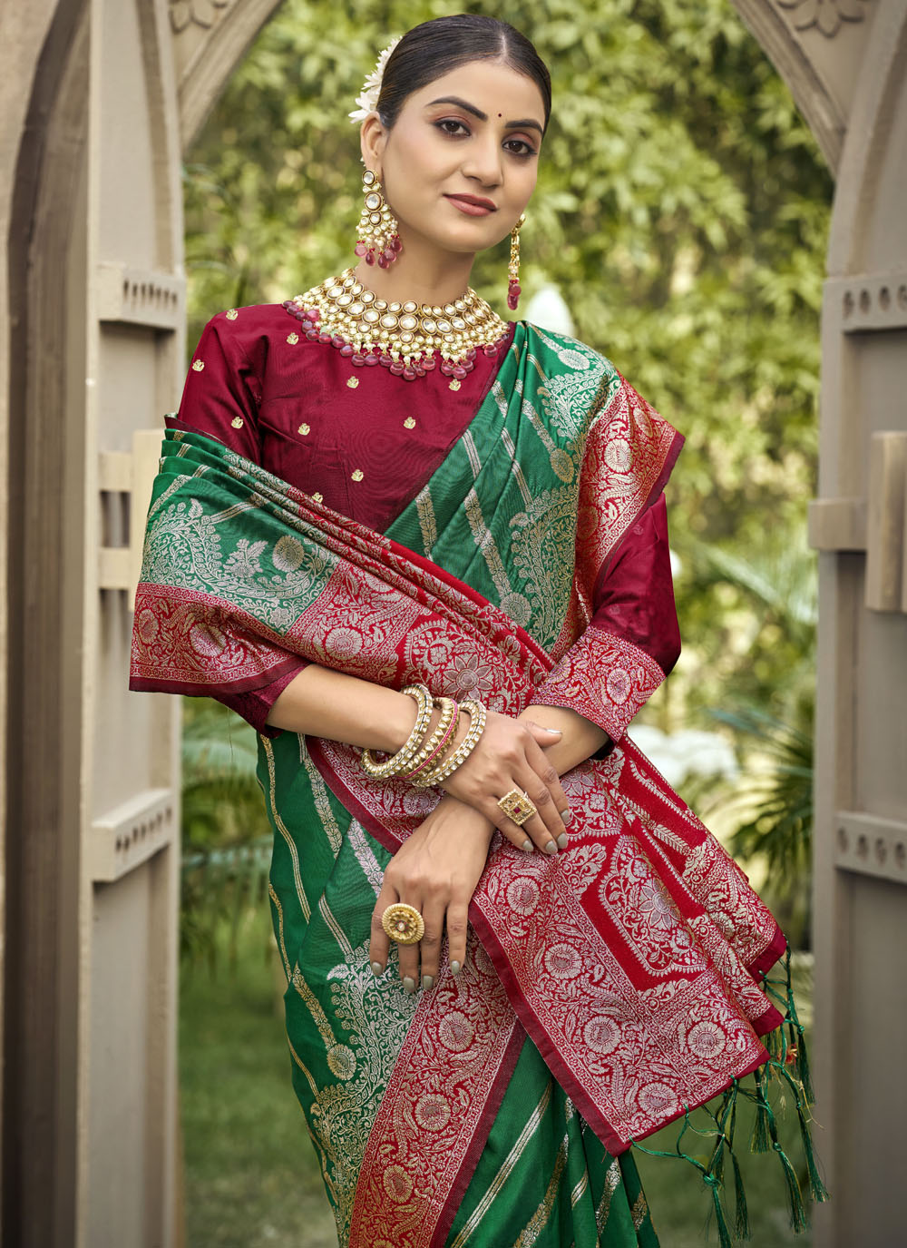 Make a stylish ethnic statement with this green Banarasi silk saree adorned with elegant zari weaving. The premium silk fabric ensures comfort and a graceful fall. Comes with matching blouse.