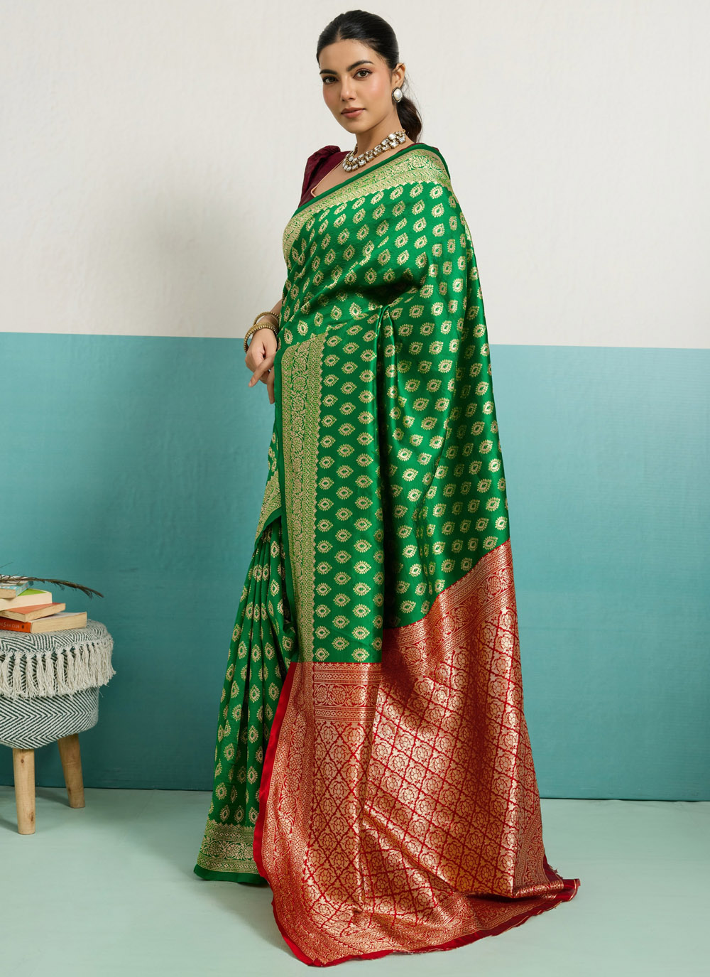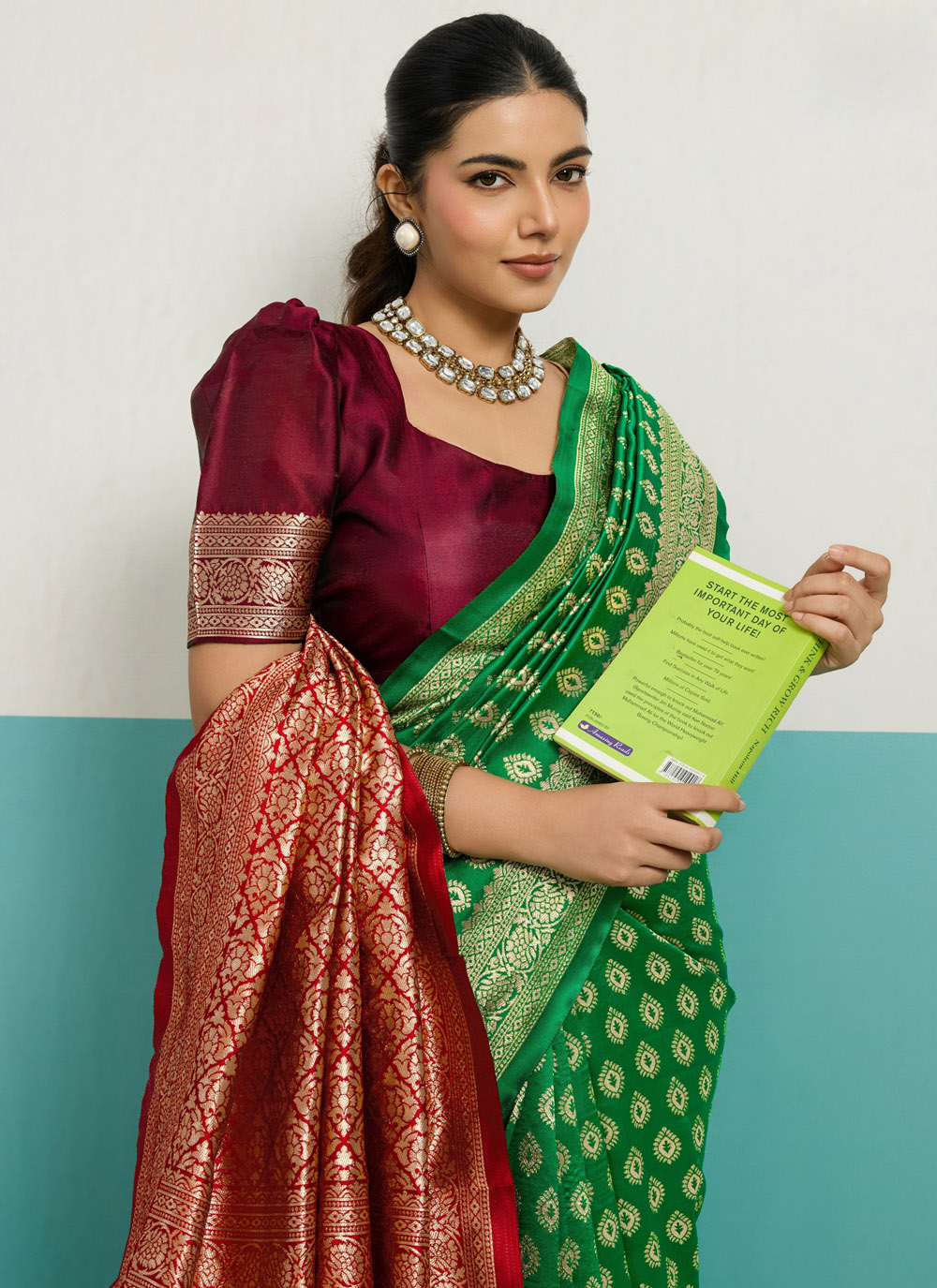 Add a statement piece to your wardrobe with this Banarasi silk zari woven green saree, designed for women who appreciate elegance and heritage. The rich silk texture combined with intricate zari work creates a stunning visual effect. Comes with matching blouse.