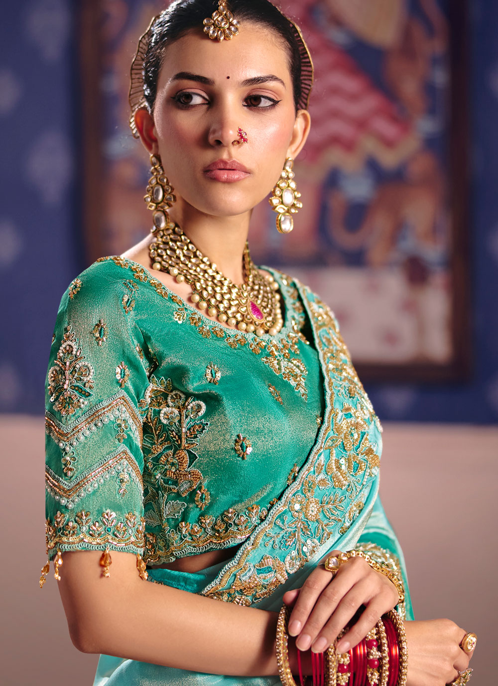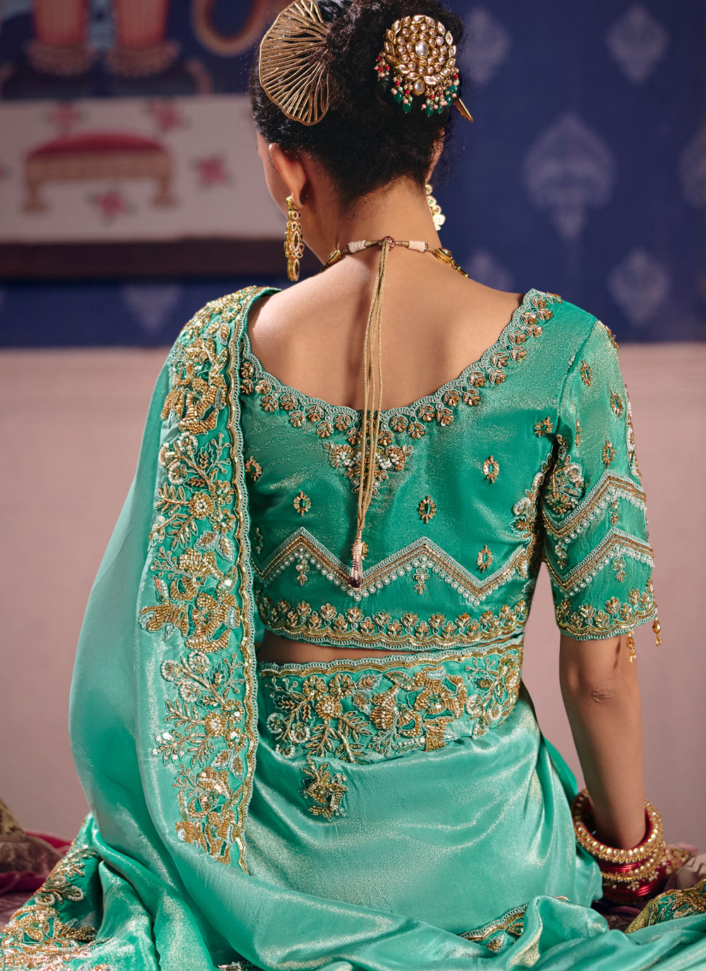 Bead Embroidered Sea Green Viscose Tissue Contemporary Saree reflects graceful elegance with a refreshing sea green shade and refined detailing. The graceful drape and soothing color tone make it a perfect attire for celebrations and formal events. Comes with matching blouse.