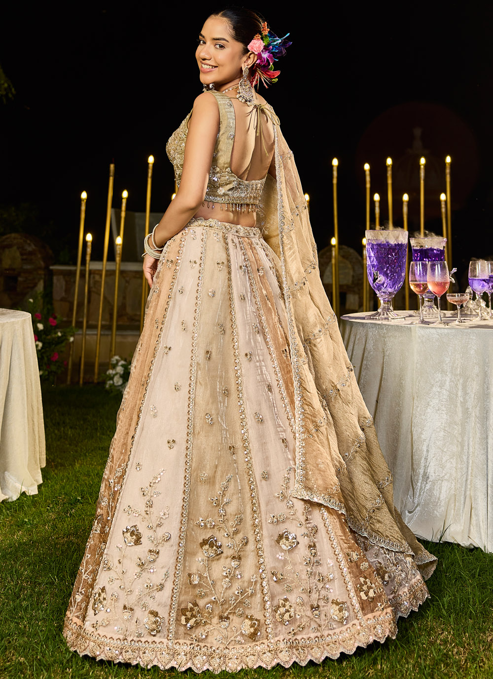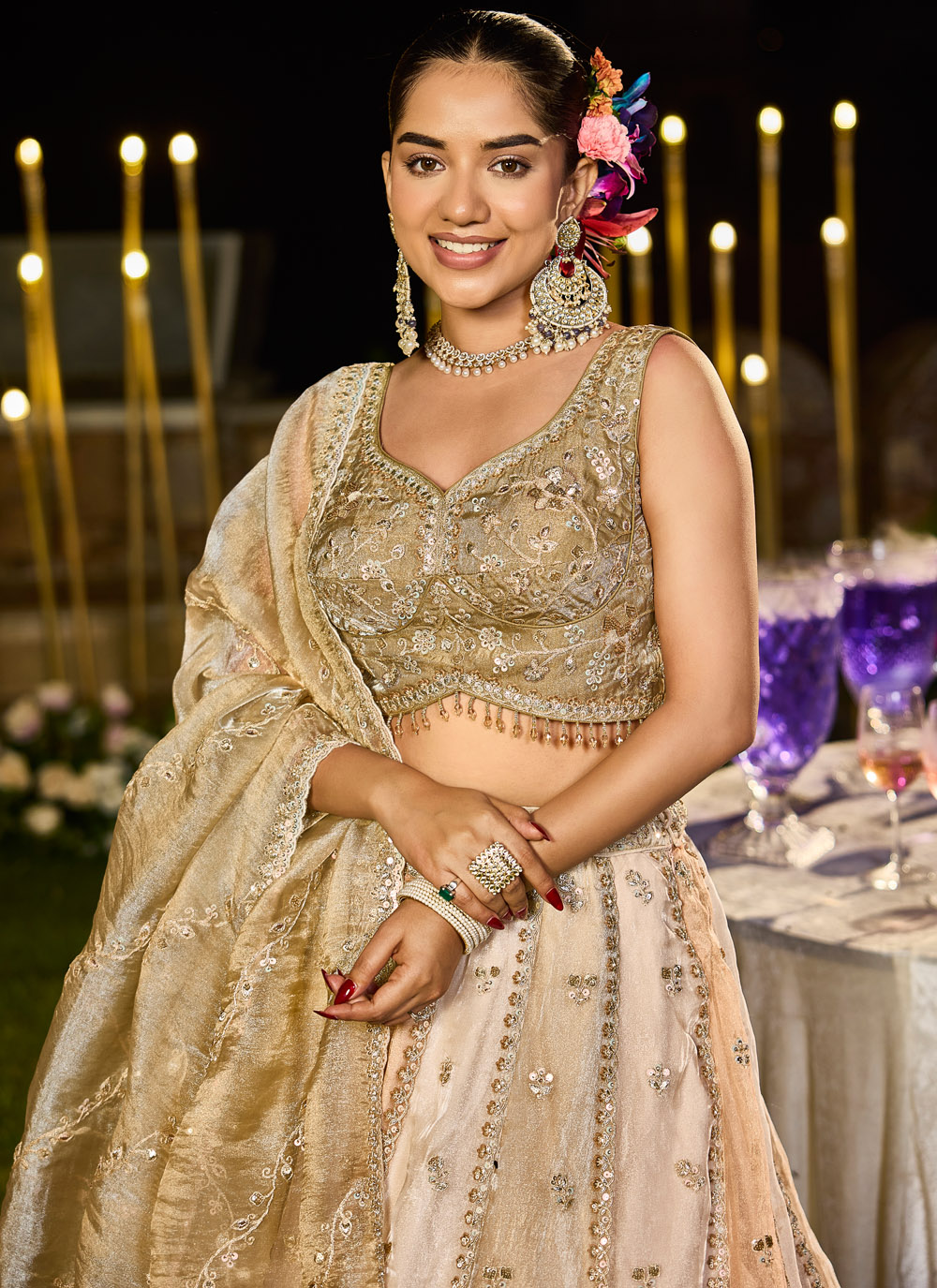 Designed in premium satin silk, this lehenga choli in beige and cream is beautifully decorated with zari and sequins work. Its readymade silhouette ensures comfort and effortless style, ideal for engagement ceremonies and wedding events. Comes with matching choli and dupatta.