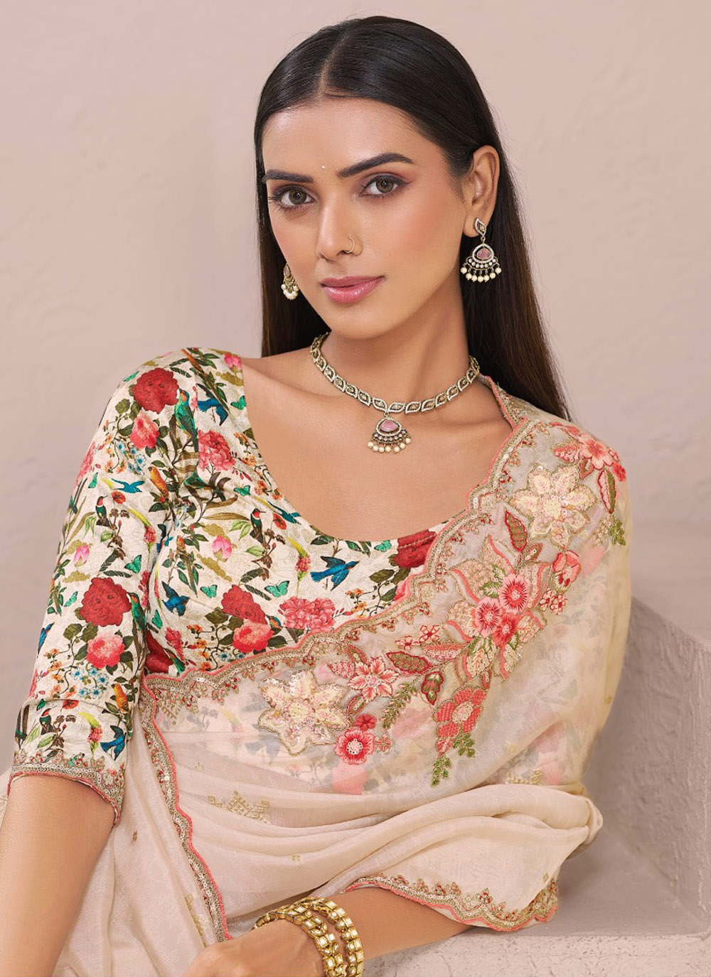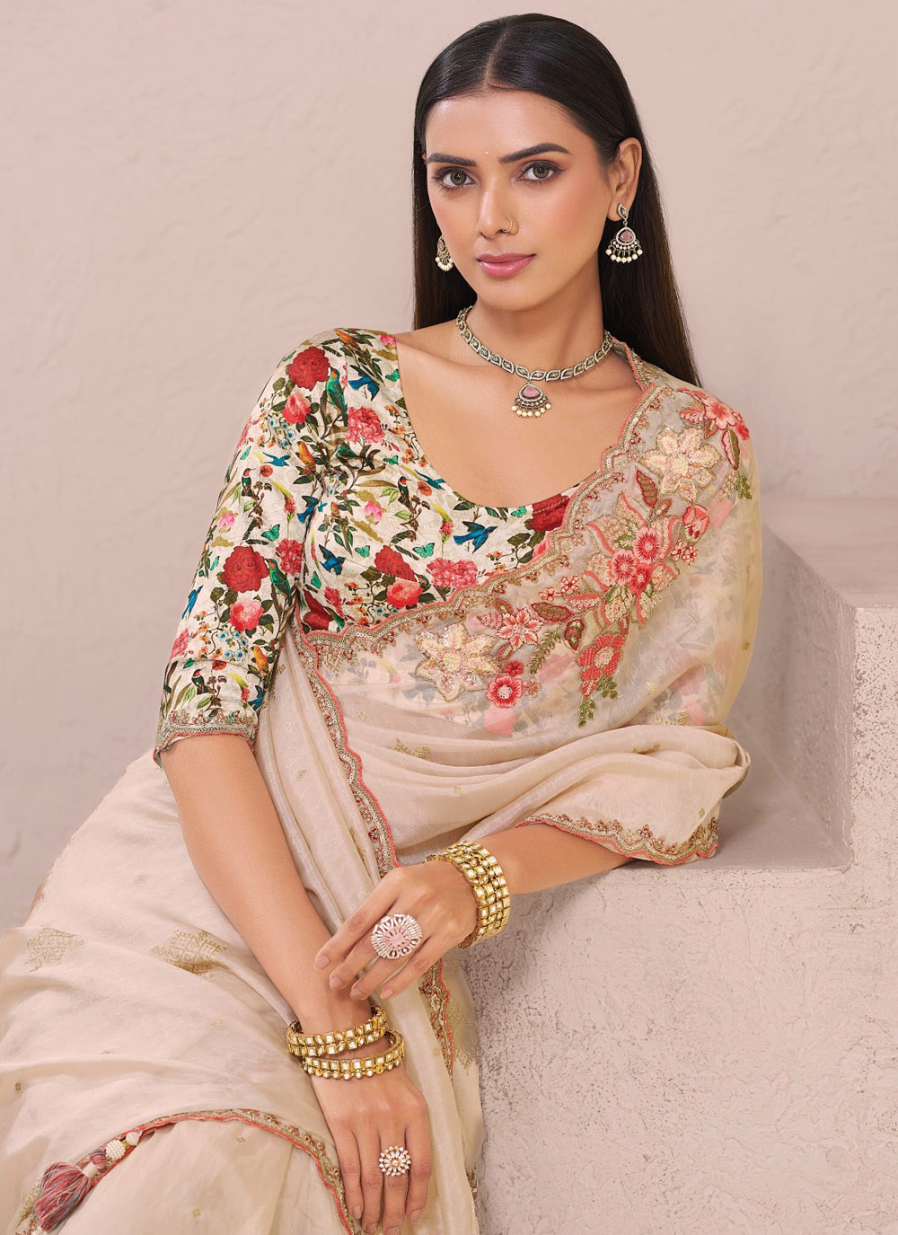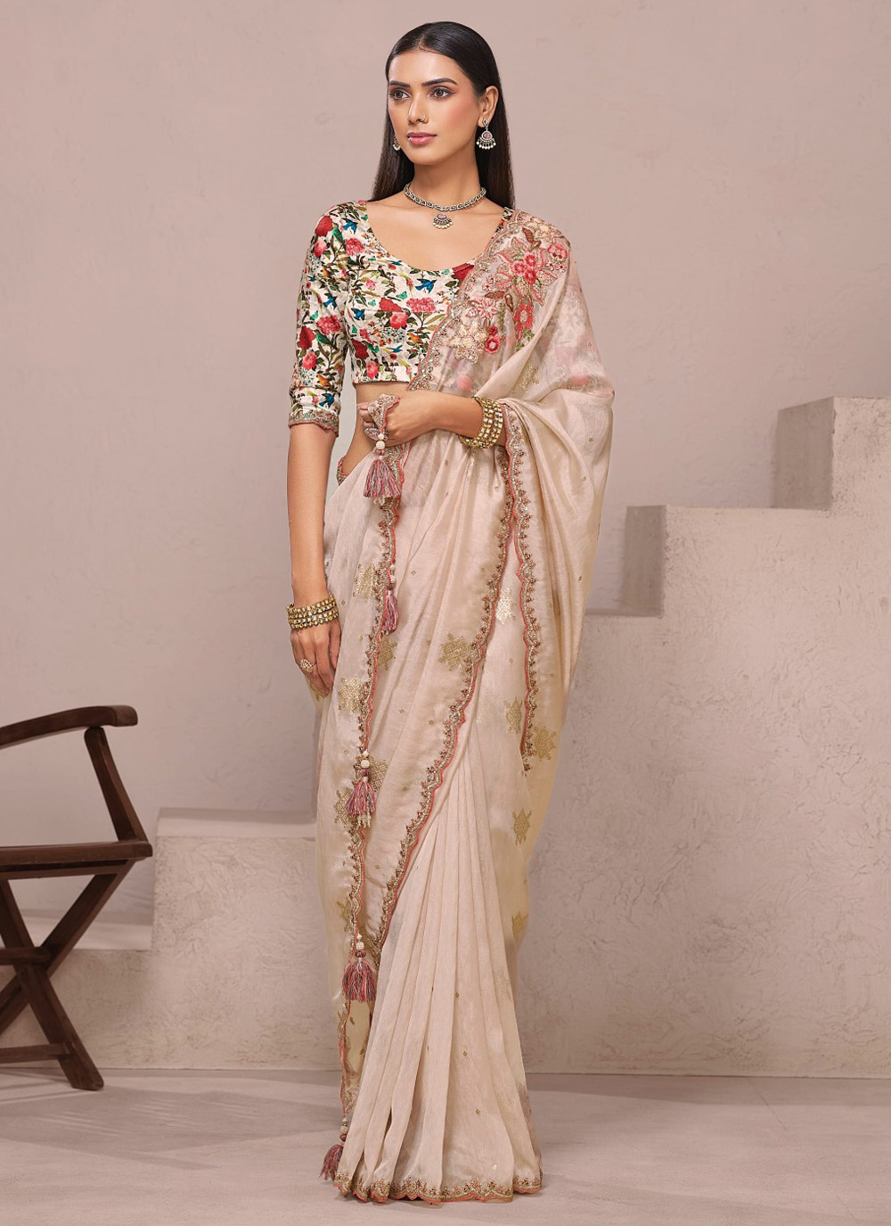 Capture hearts in this beige fancy fabric saree, intricately adorned with embroidered detailing and graceful cut work. Its soft hue and elegant craftsmanship make it the perfect pick for engagement ceremonies and pre-wedding celebrations. Comes with matching blouse.