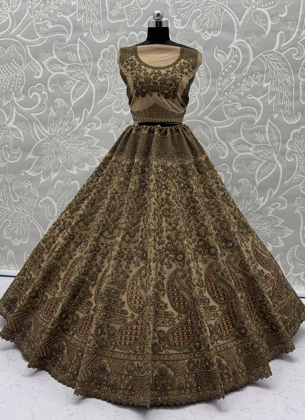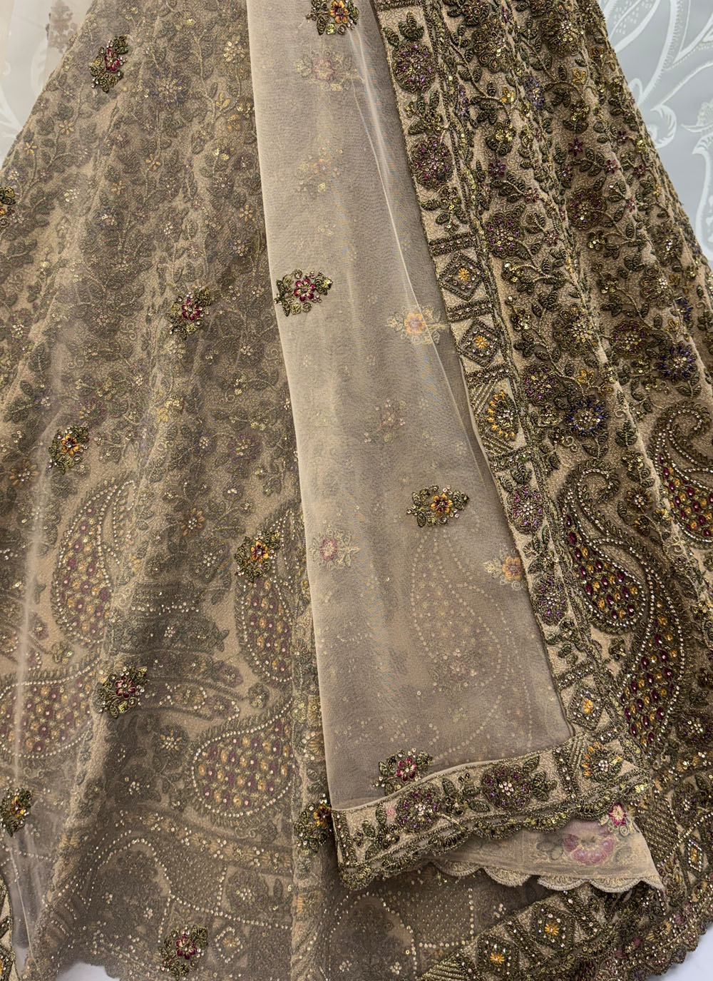 Enhance your celebration style with this Beige Embroidered Dori Zari Zarkan Thread Sequins Work Designer Lehenga Choli. The designer outfit features elegant embroidery enriched with dori work, shimmering sequins, and delicate zarkan embellishments. Comes with matching choli and dupatta.