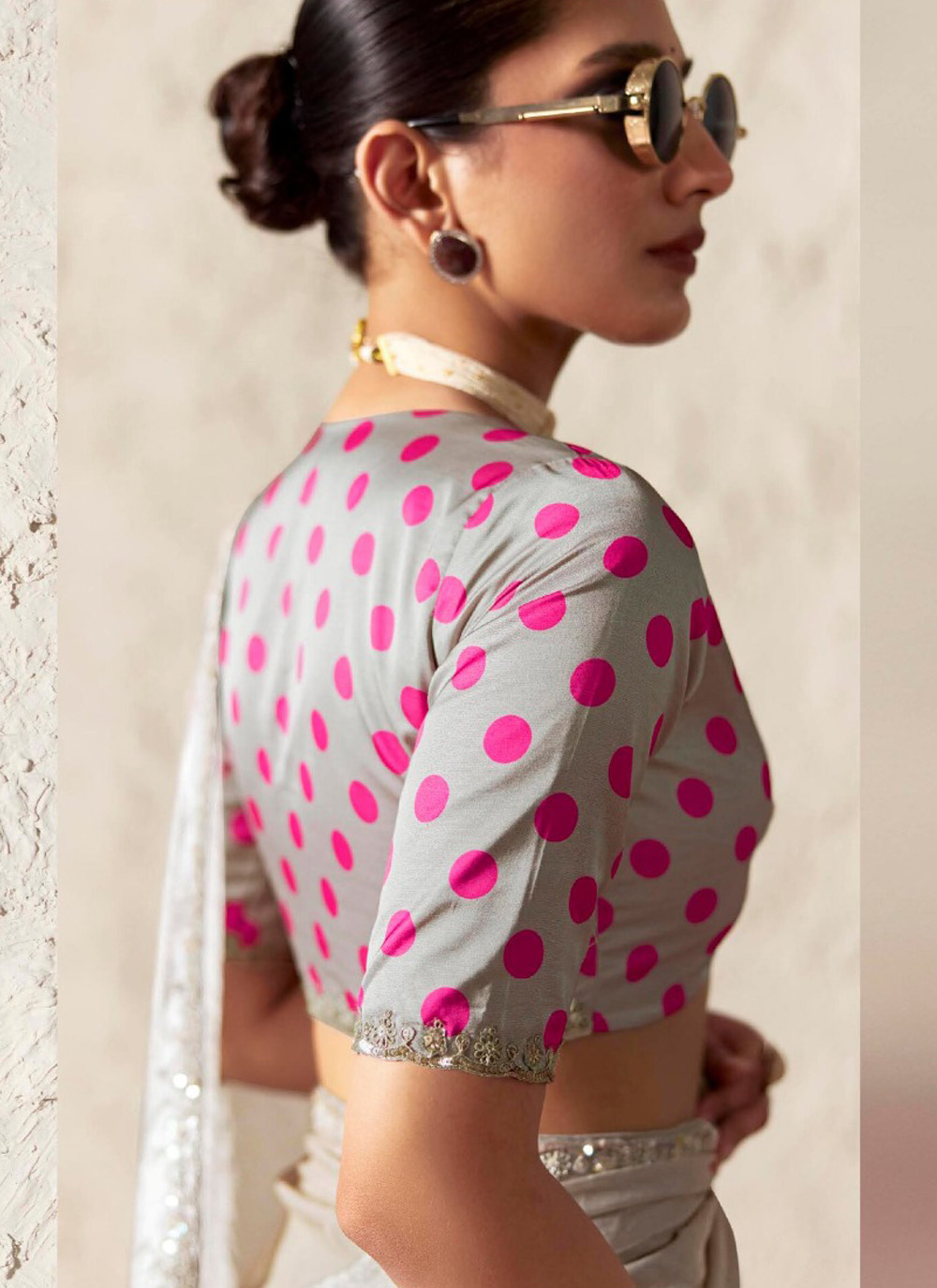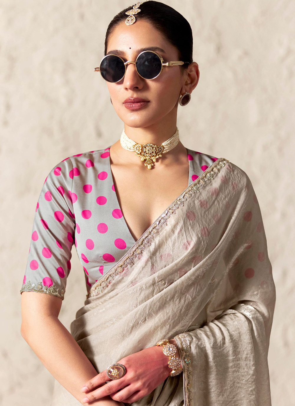 This trendy beige ceremonial saree stands out with its graceful embroidery and premium fabric finish. The sequins and thread work is thoughtfully placed to highlight the overall design without overpowering it. Comes with matching blouse.