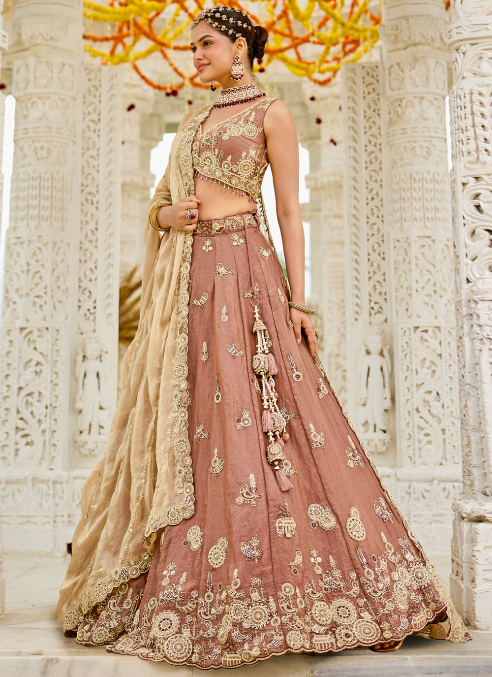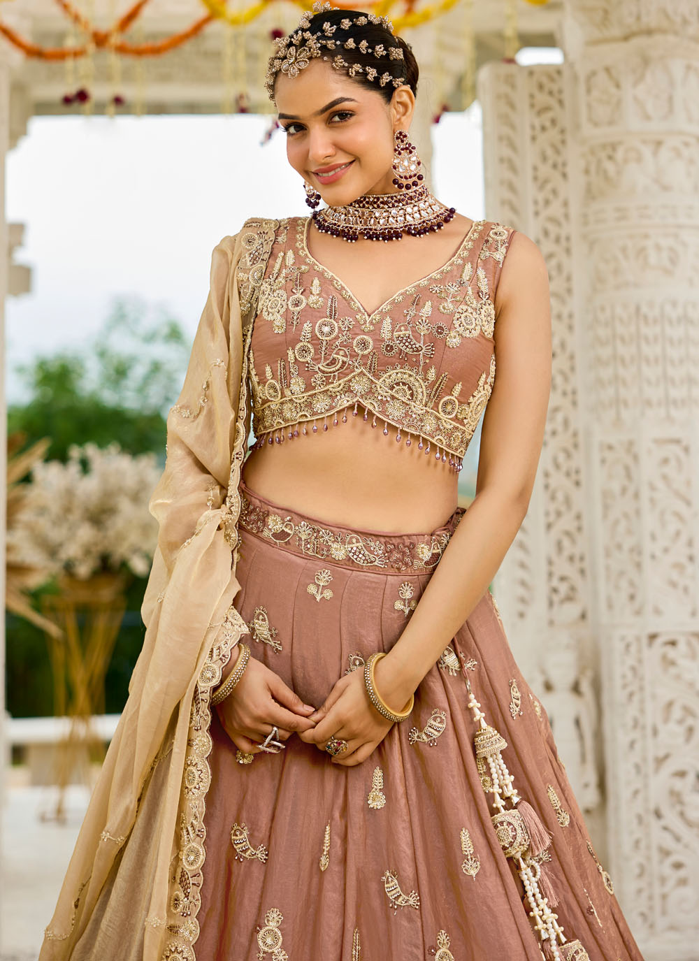 Celebrate in style with this beige satin silk designer lehenga choli, highlighted with handcrafted embroidery and shimmering embellishments. Its neutral tone and detailing make it a chic choice for modern celebrations. Comes with matching choli and dupatta.