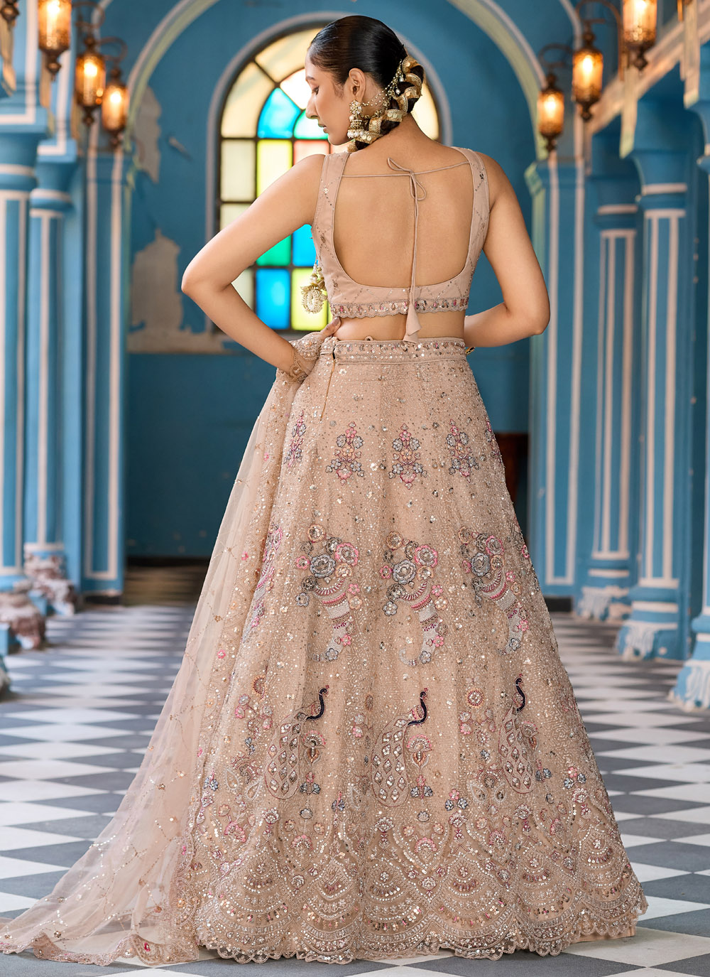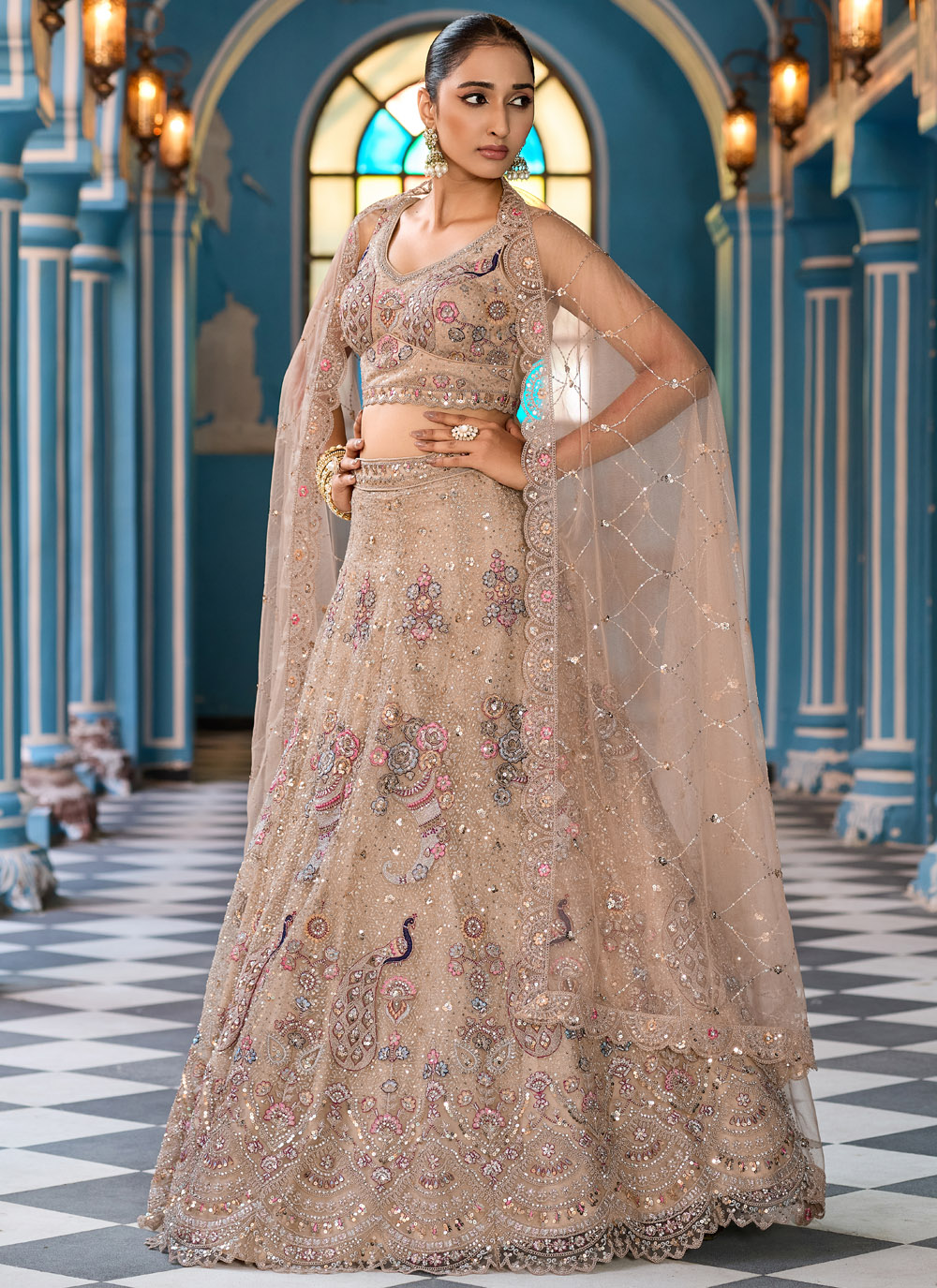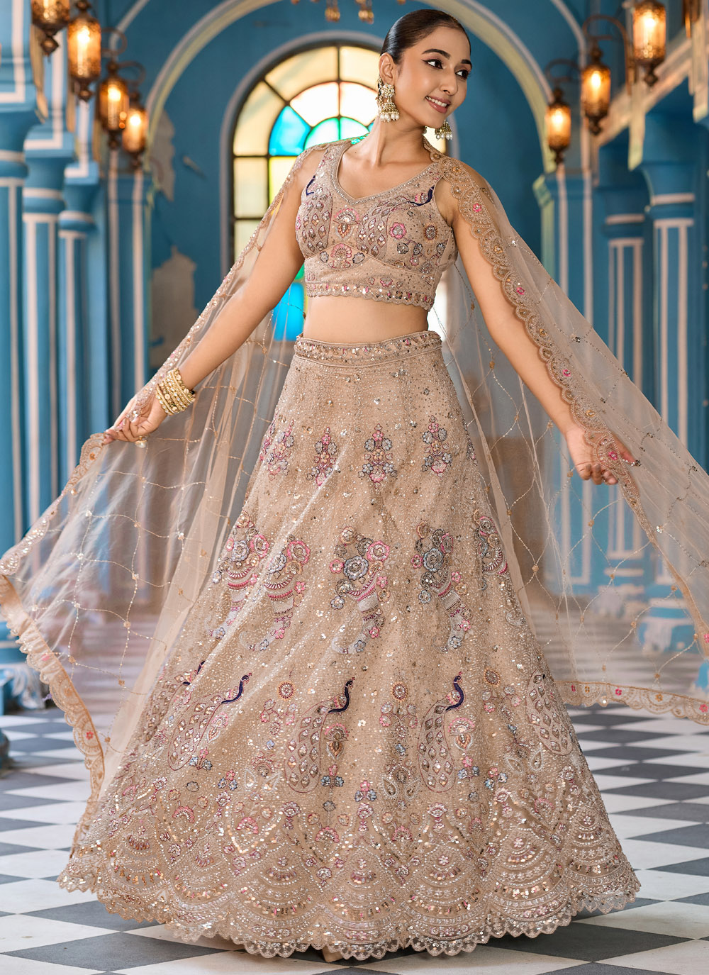 This beige Sangeet lehenga choli combines rich traditional embroidery with contemporary flair. The net fabric is adorned with carefully placed sequins and sparkling stones, making the outfit shine with every move. Comes with matching choli and dupatta.
