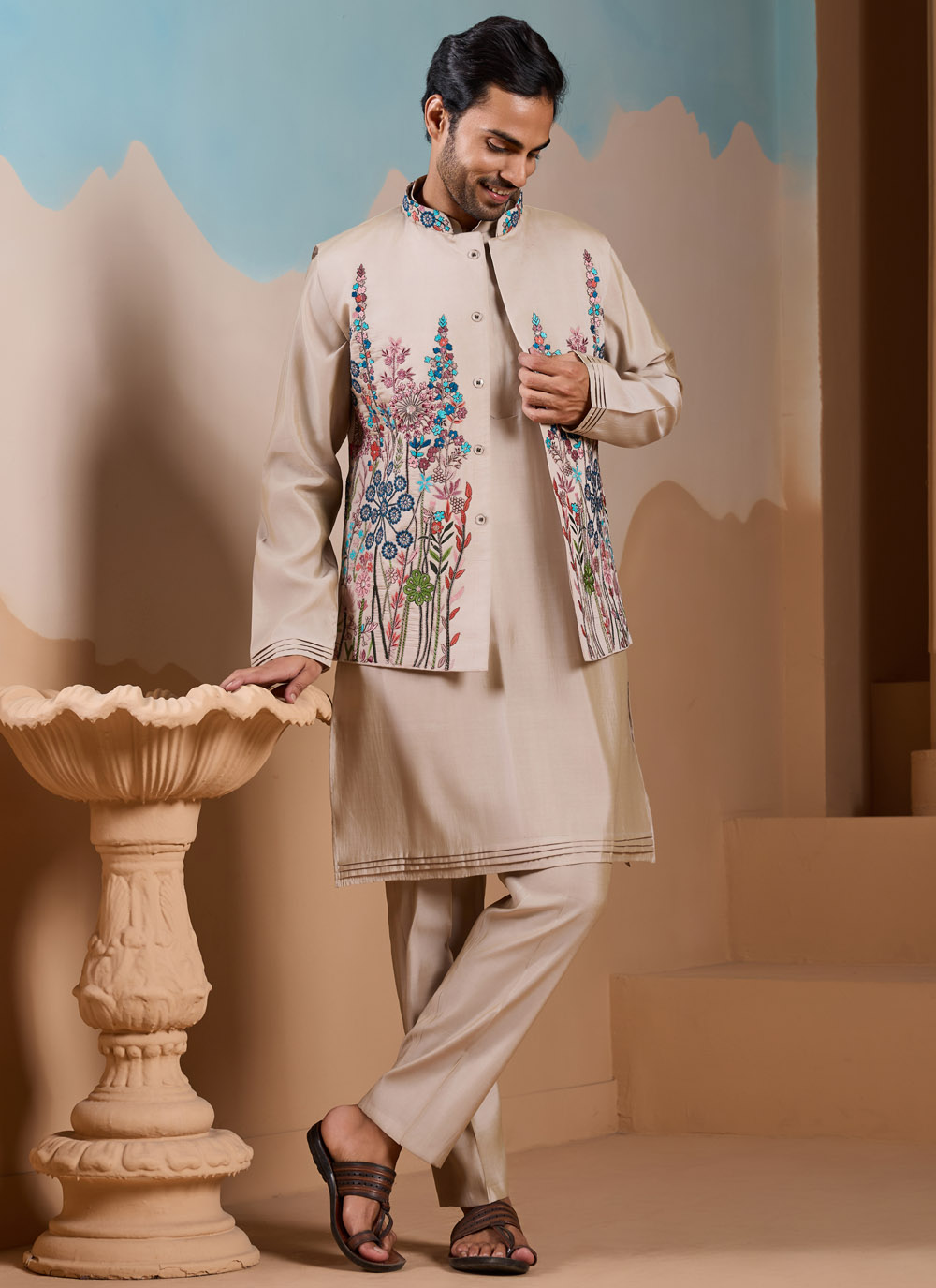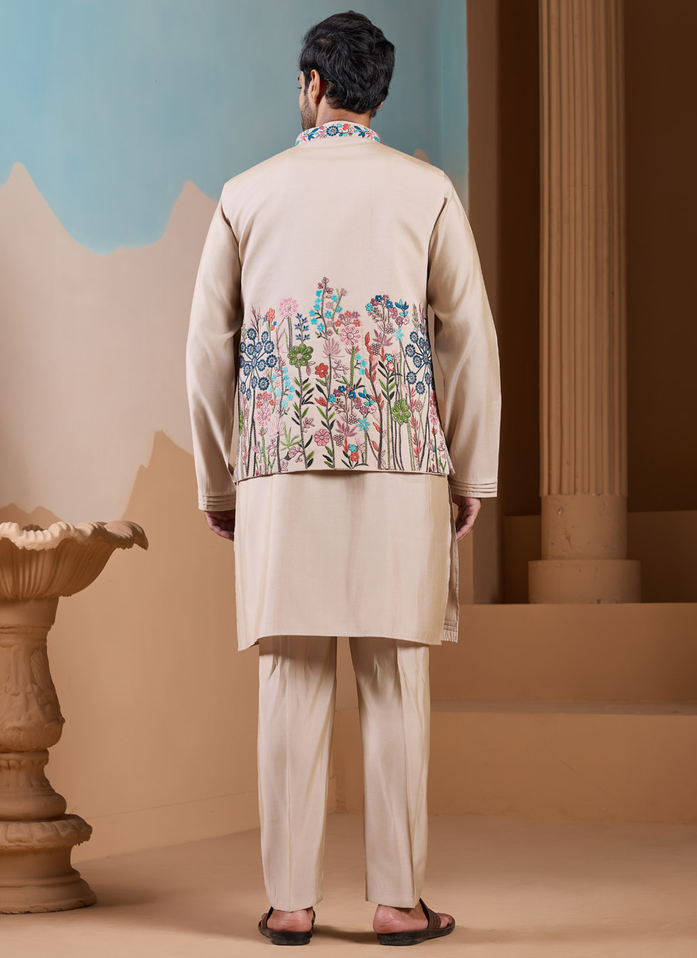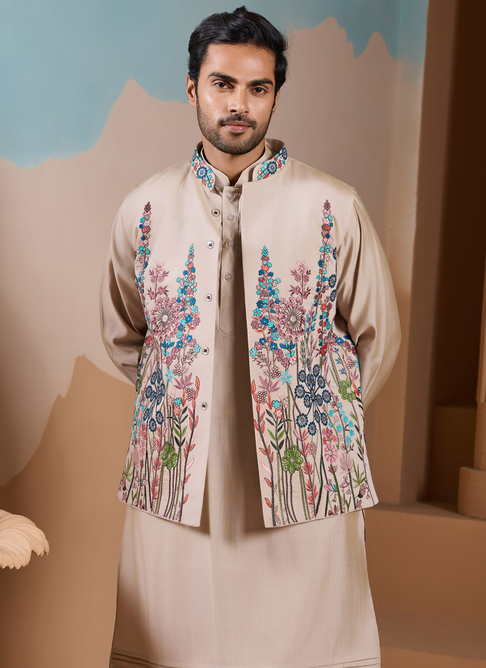 The warm beige tone highlights the multi-thread embroidery beautifully, while the sequin detailing gives a subtle shine. Completed with a stylish jacket, this kurta payjama set offers a classic yet refined style for special occasions.