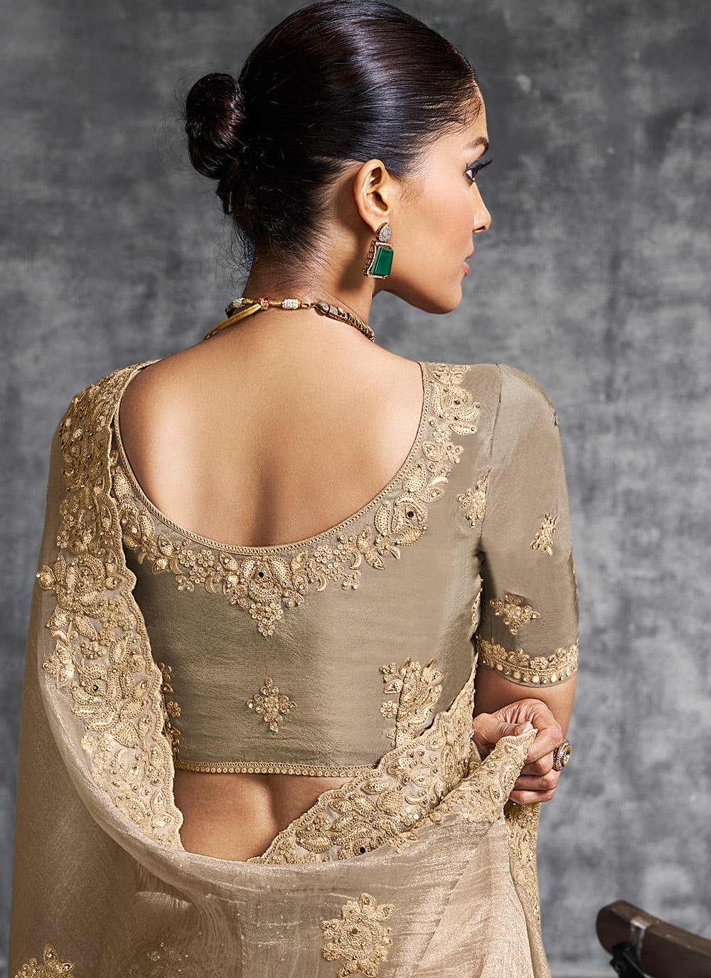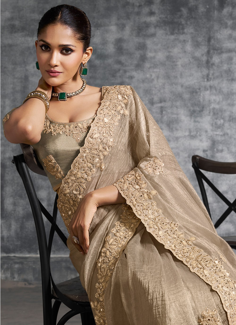 This beige tissue saree radiates timeless charm with its resham thread embroidery, highlighted by sequins and stone work. The soft beige tone makes it versatile, while the embellishments add a sparkle. perfect for weddings or festive occasions. Comes with matching blouse.
