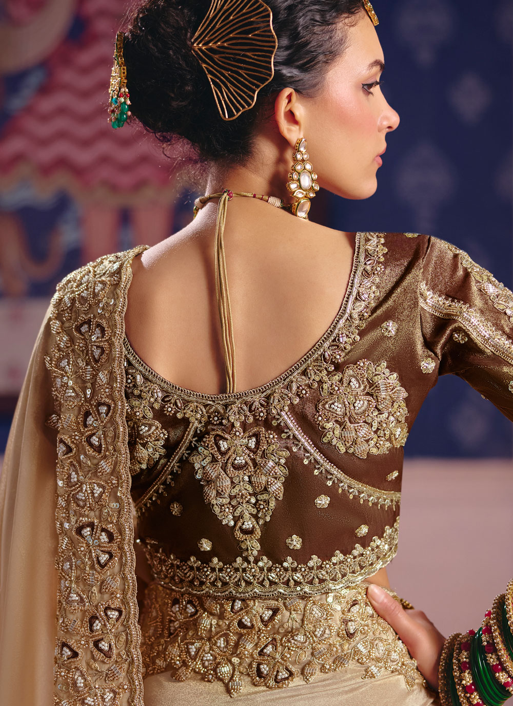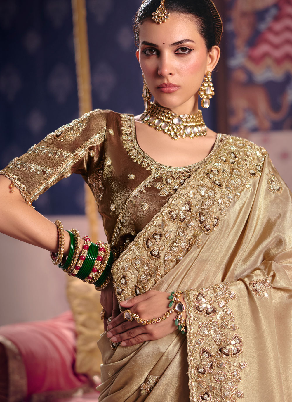 Designed for elegance and celebration, this beige tissue viscose silk saree is adorned with intricate bead embroidery that highlights its charm. The refined shade and graceful texture make it ideal for engagement ceremonies and festive gatherings. Comes with matching blouse.