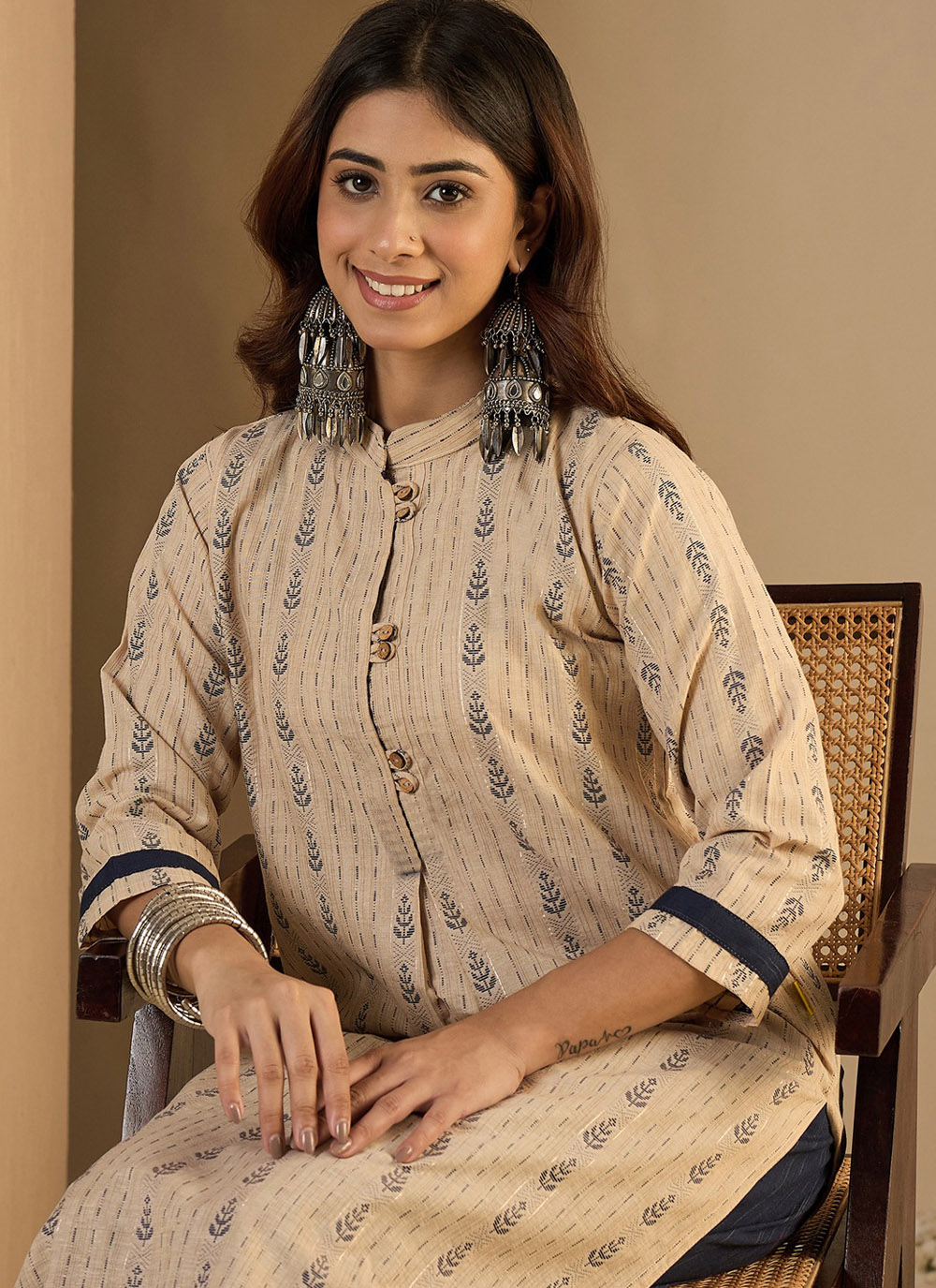 Refresh your wardrobe with this beautifully crafted Beige Woven Cotton Designer Kurti. The delicate woven design highlights the texture of the fabric while maintaining a clean and elegant appearance.