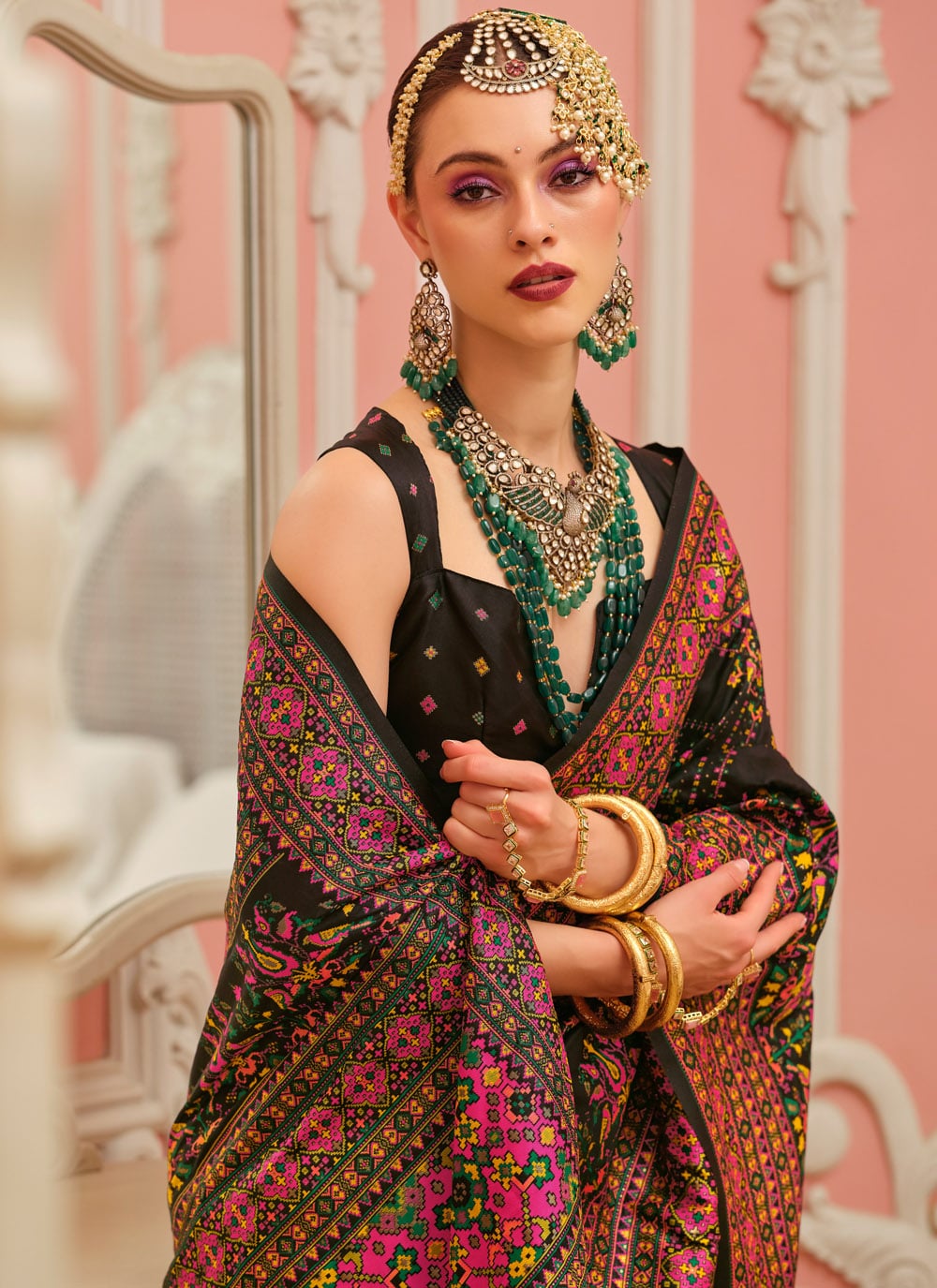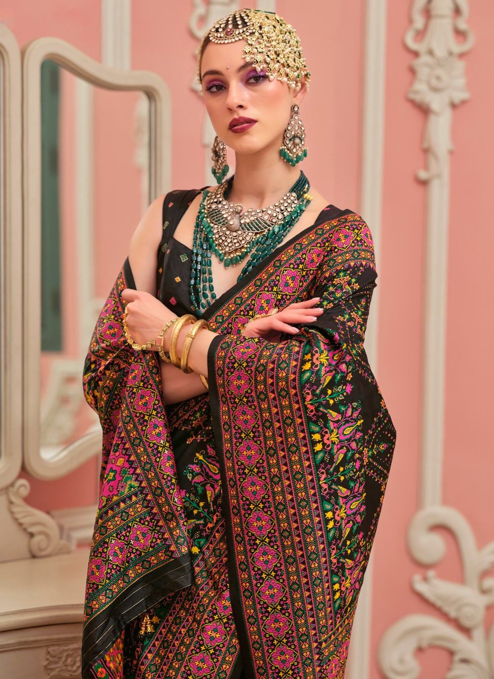 This stunning black Banarasi Silk saree is a masterpiece designed with luxurious Meenakari weaving work. The contrast of vibrant woven patterns against the deep black backdrop creates a royal look. Ideal for receptions and sangeet functions. Comes with matching blouse.