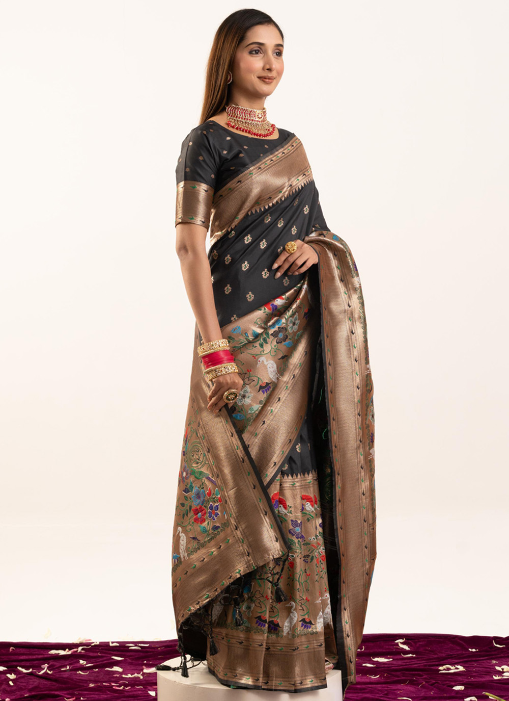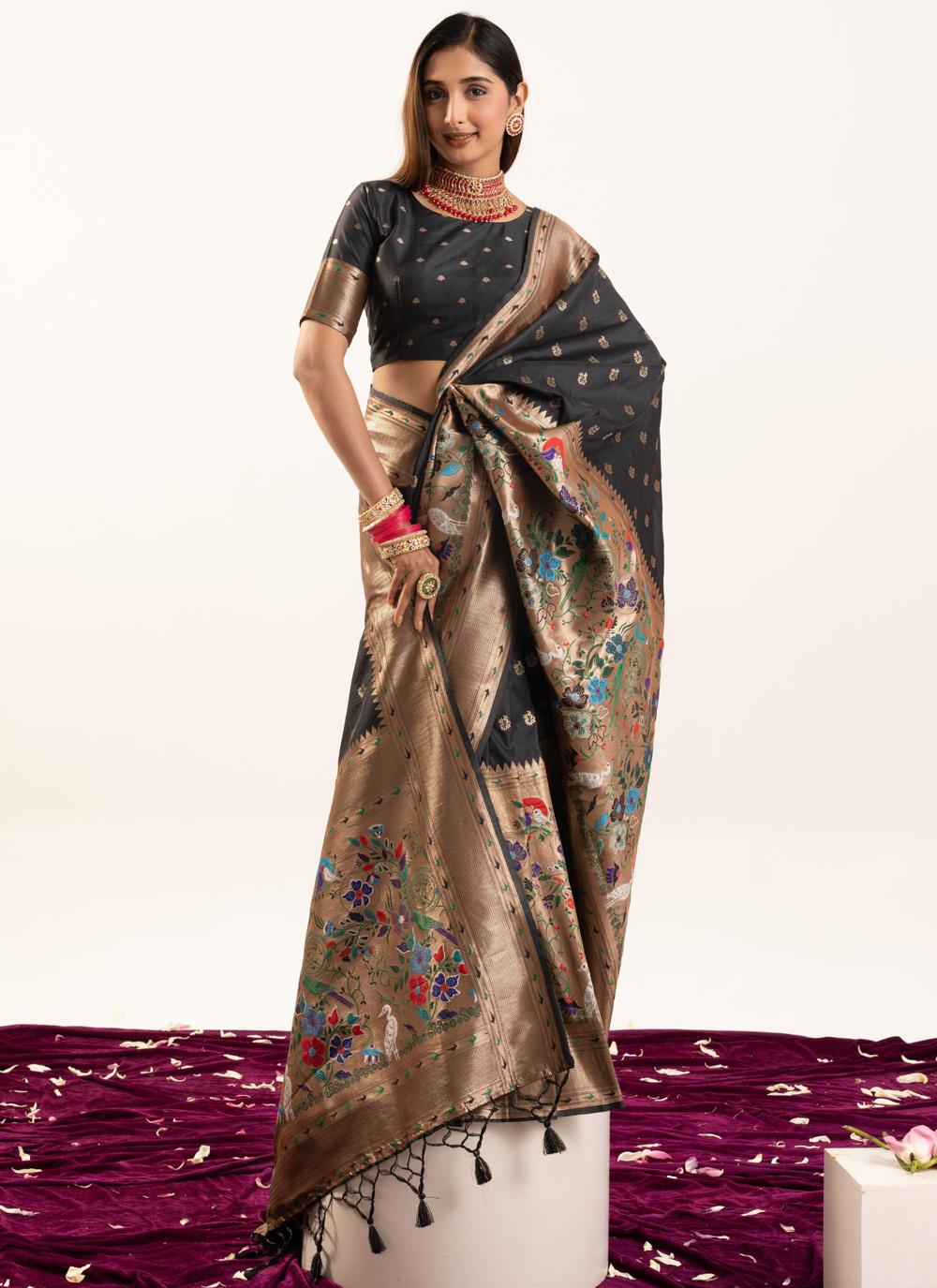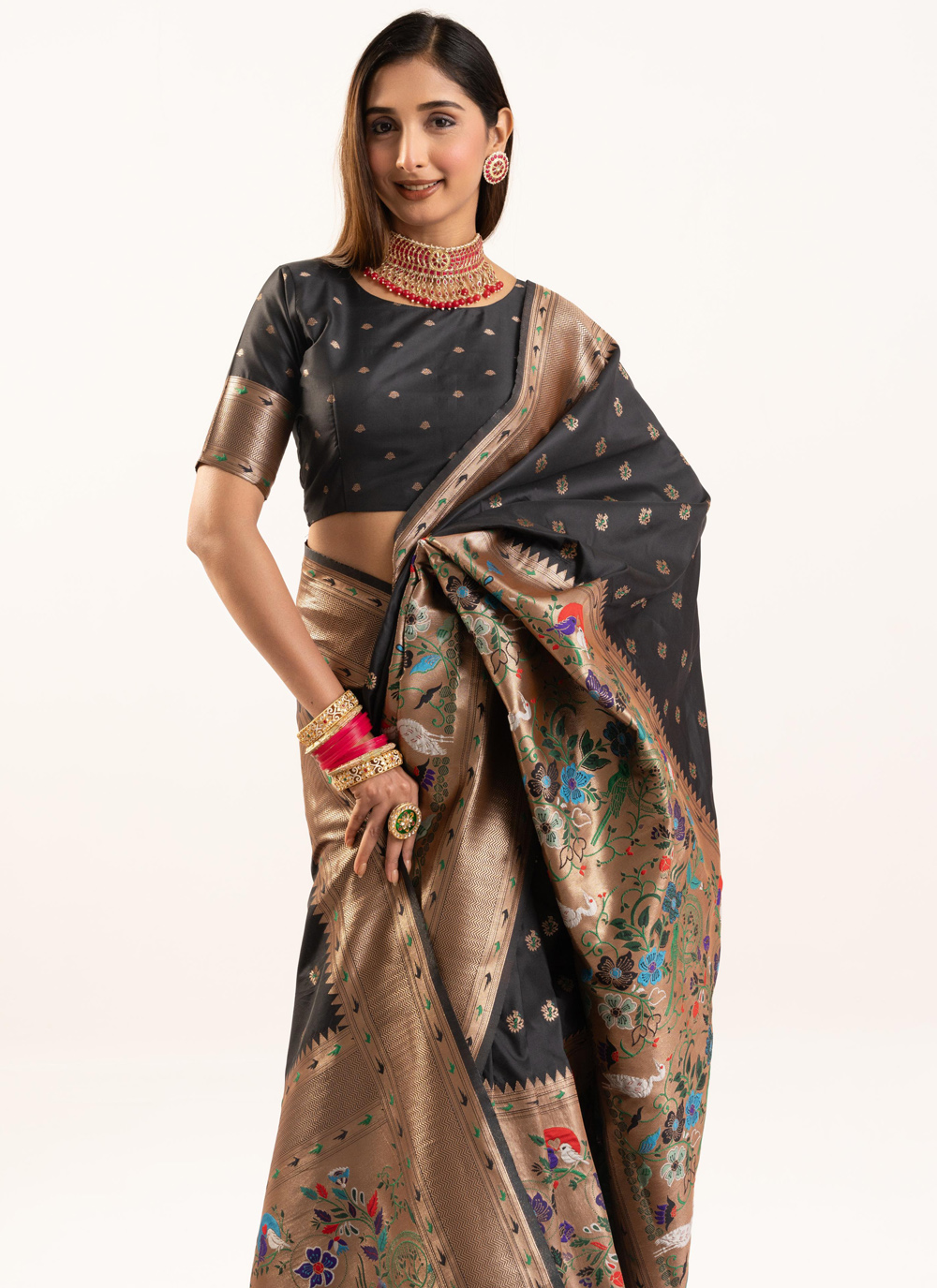 Experience timeless elegance with this Black Banarasi Silk Zari Weaving Work Designer Saree. The rich black shade beautifully enhances the intricate zari weaving, creating a graceful and fashionable ethnic look. Comes with matching blouse.