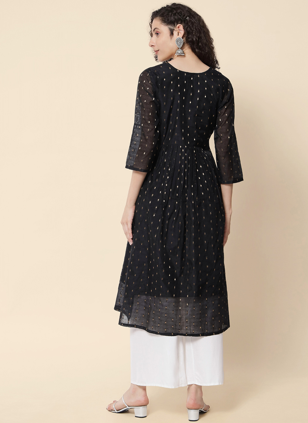 Make a graceful fashion statement with this stunning black Chanderi embroidered designer kurti. The fabric and detailed embroidery create a rich and elegant appearance.