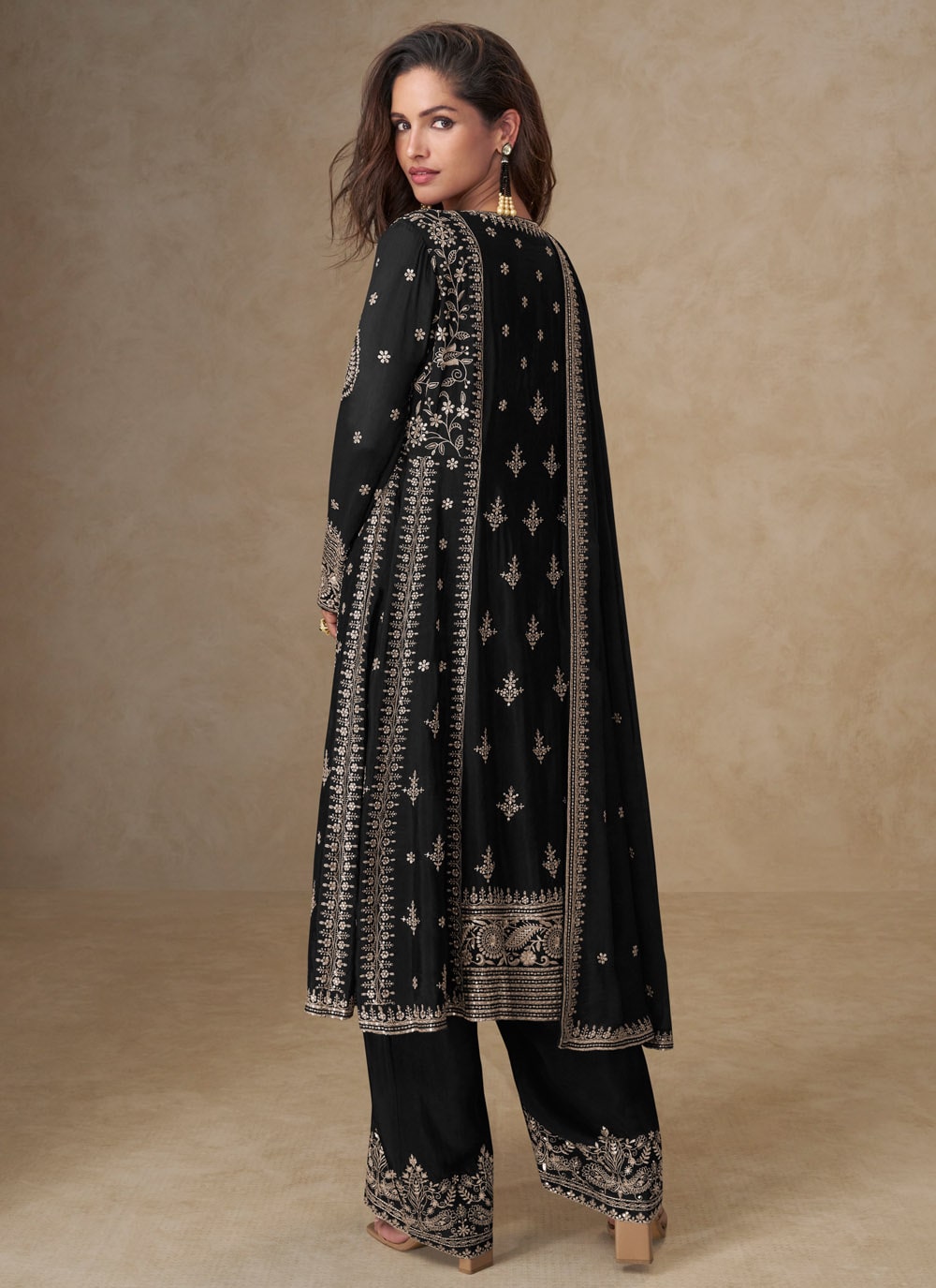 Elevate your ethnic wardrobe with this stunning Embroidered Salwar Suit in Black Chinon Silk. Intricate threadwork gives it a regal charm, while the soft, flowy fabric adds effortless grace. Comes with matching bottom and dupatta.