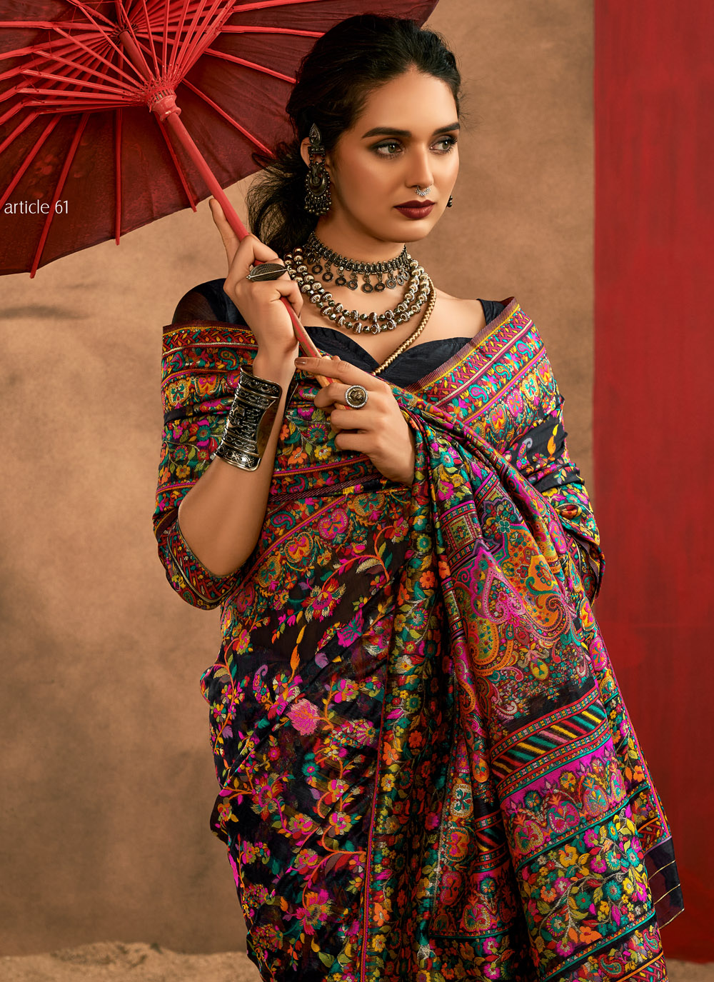 Perfect for parties and stylish gatherings, this black cotton pashmina saree blends comfort with modern elegance. Its woven detailing and refined finish create a graceful yet trendy look. Comes with matching blouse.