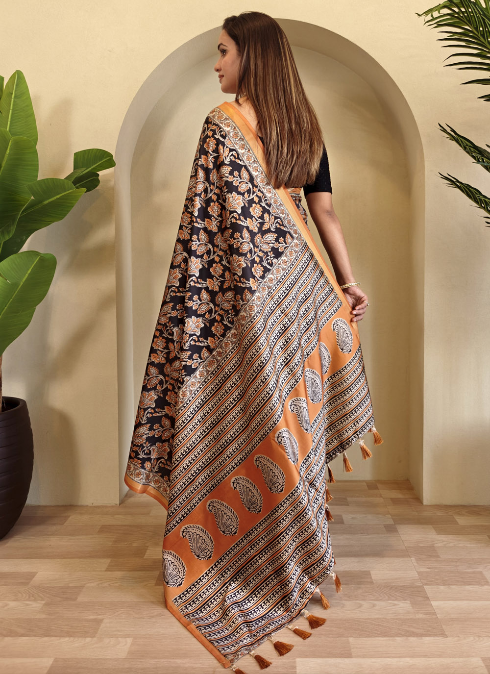 Embrace timeless style with this Black Dola Viscose Traditional Printed Saree. Adorned with ethnic-inspired prints, this saree showcases classic Indian design on a soft and breathable dola viscose base. Ideal for festival, cultural events or elegant daywear. Comes with matching blouse.