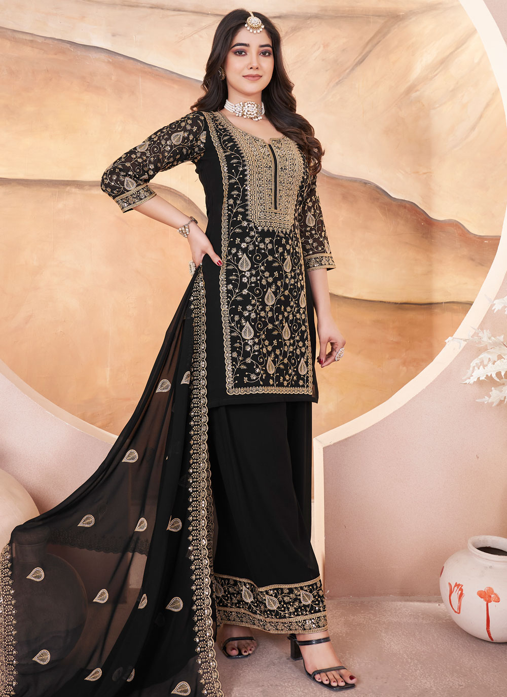 This Black Embroidered Designer Readymade Salwar Suit, with a matching bottom and dupatta, features intricate embroidery and a timeless black color. Perfect for weddings and festive occasions, it offers elegance, comfort, and a ready-to-wear design for a flawless look.