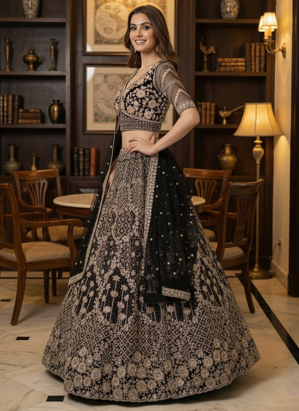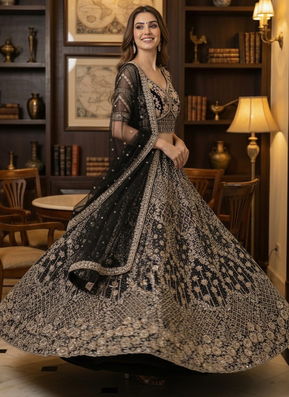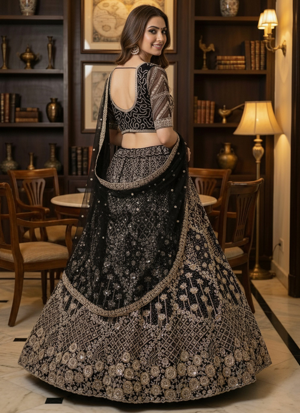 Make a statement in this stunning black embroidered net lehenga choli, adorned with vibrant multicolor threadwork and fine dori detailing. The shimmering sequins add a sparkling layer that enhances its regal charm. Comes with matching choli and dupatta.