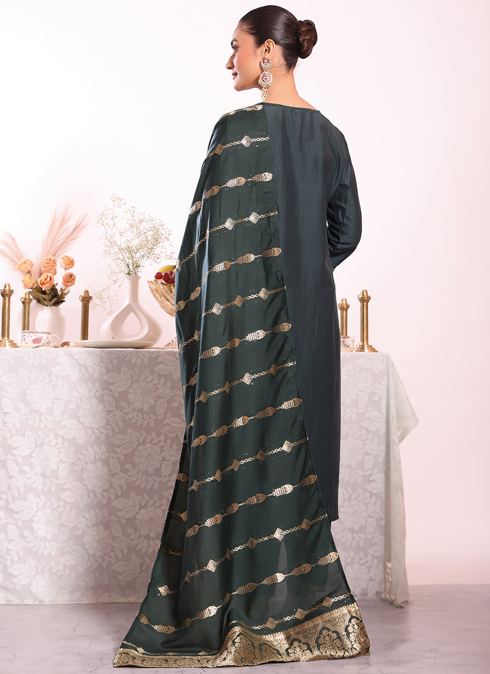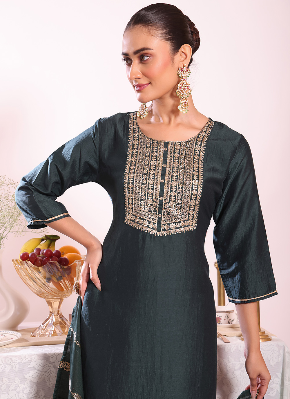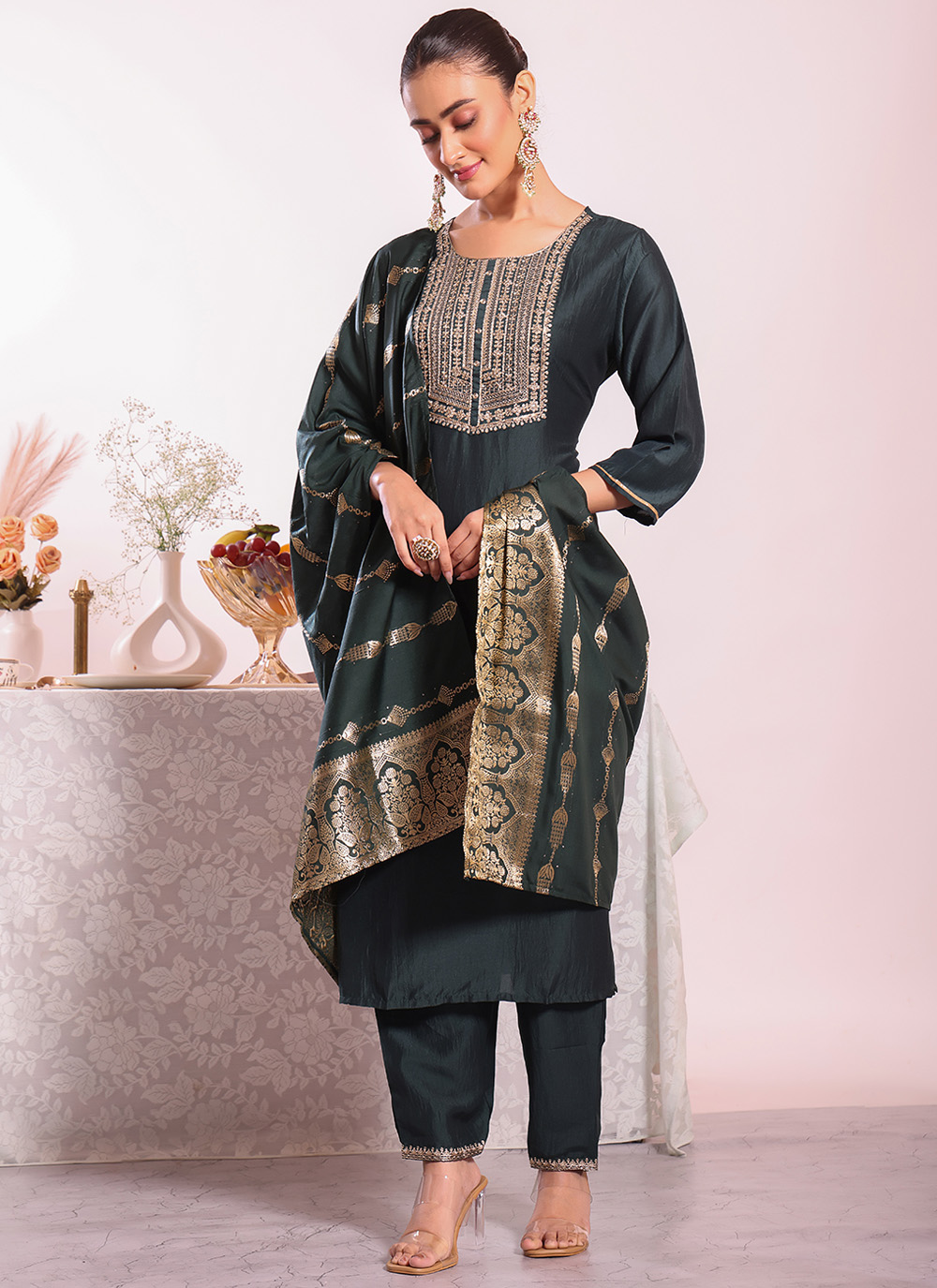 Add classic charm to your wardrobe with this beautifully embroidered black poly silk salwar kameez. The elegant craftsmanship highlights the richness of the dark hue, while the smooth fabric drapes effortlessly. Comes with matching bottom and dupatta.