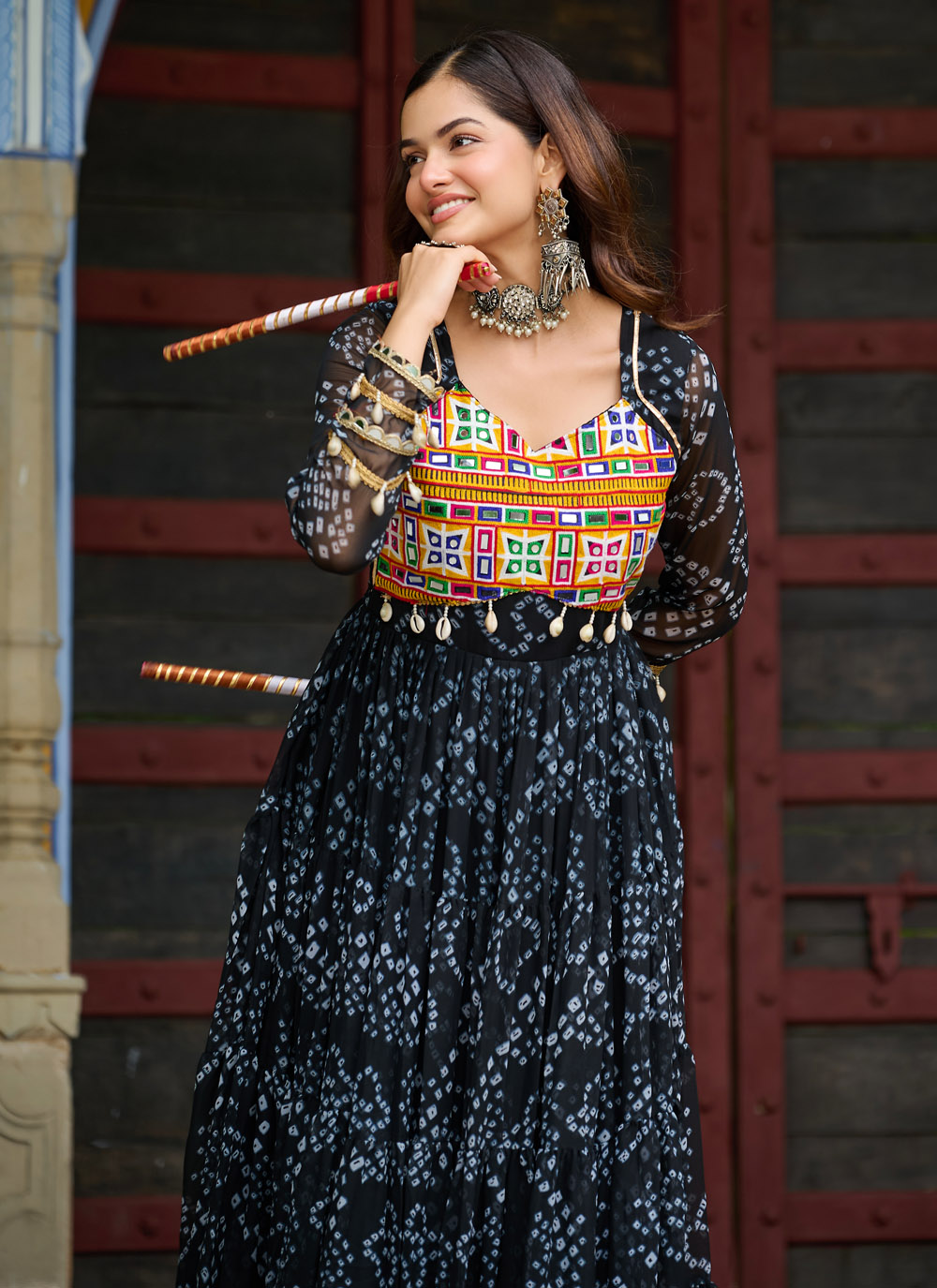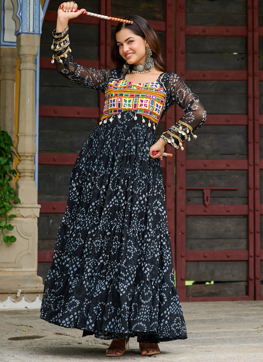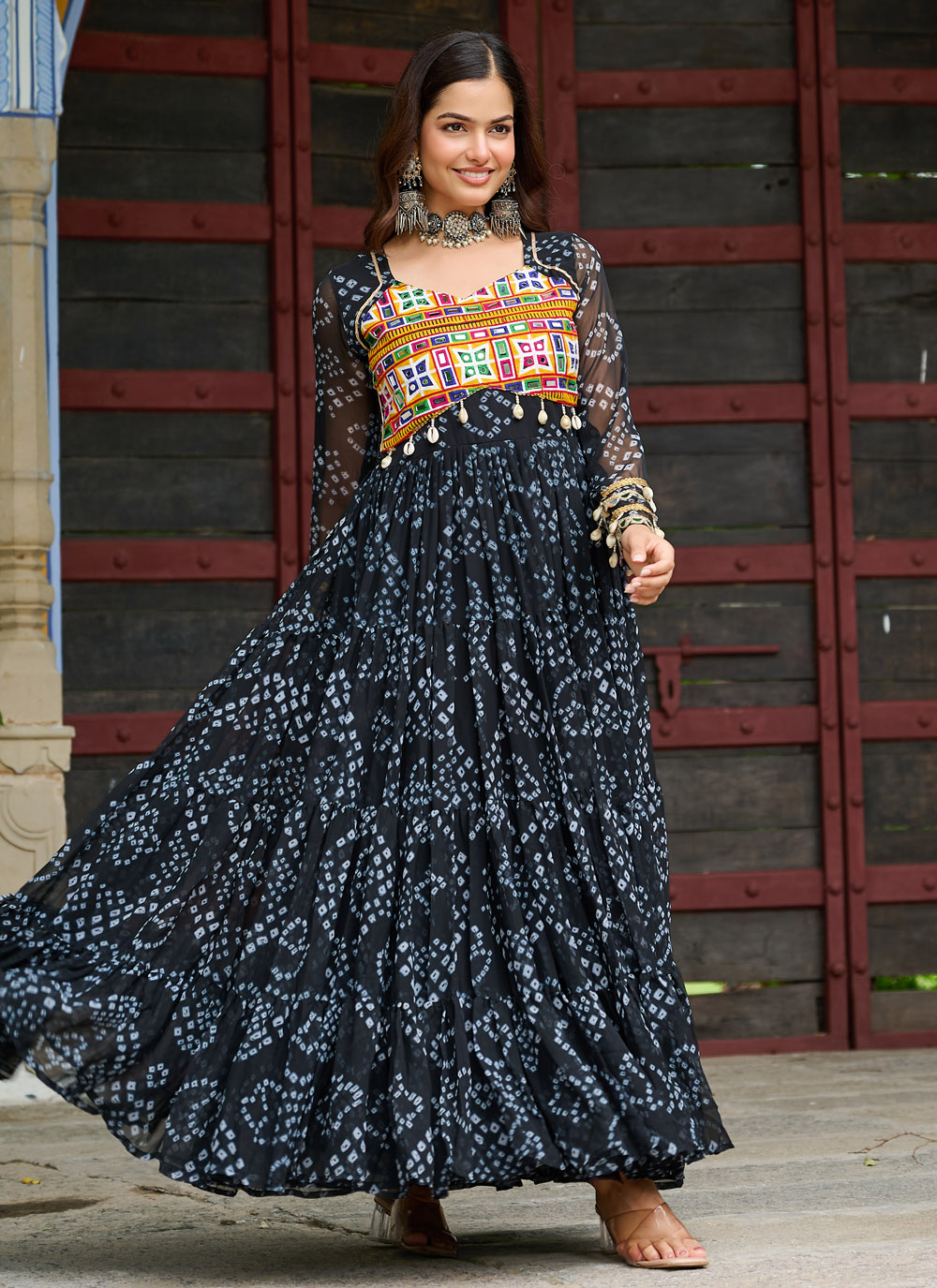 Celebrate tradition with a contemporary vibe in this Black Gamthi Work Gown, tailored in soft faux georgette. The colorful patchwork and printed accents add texture and heritage to this modern ethnic silhouette.