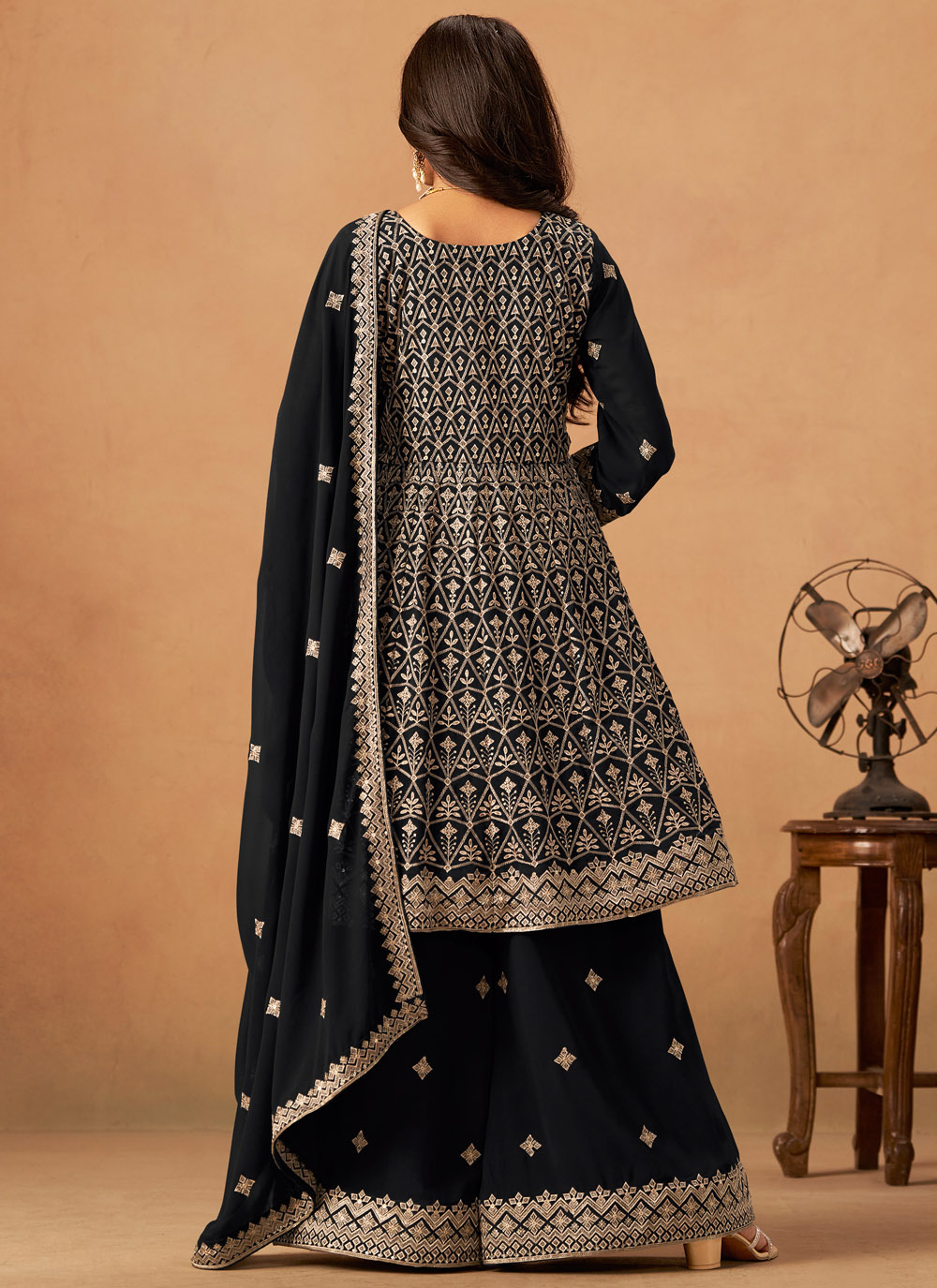 Designed for modern ethnic fashion, this Designer Black Salwar Kameez is enhanced with detailed thread embroidery, making it an elegant addition to any festive or wedding wardrobe. Comes with matching bottom and dupatta.