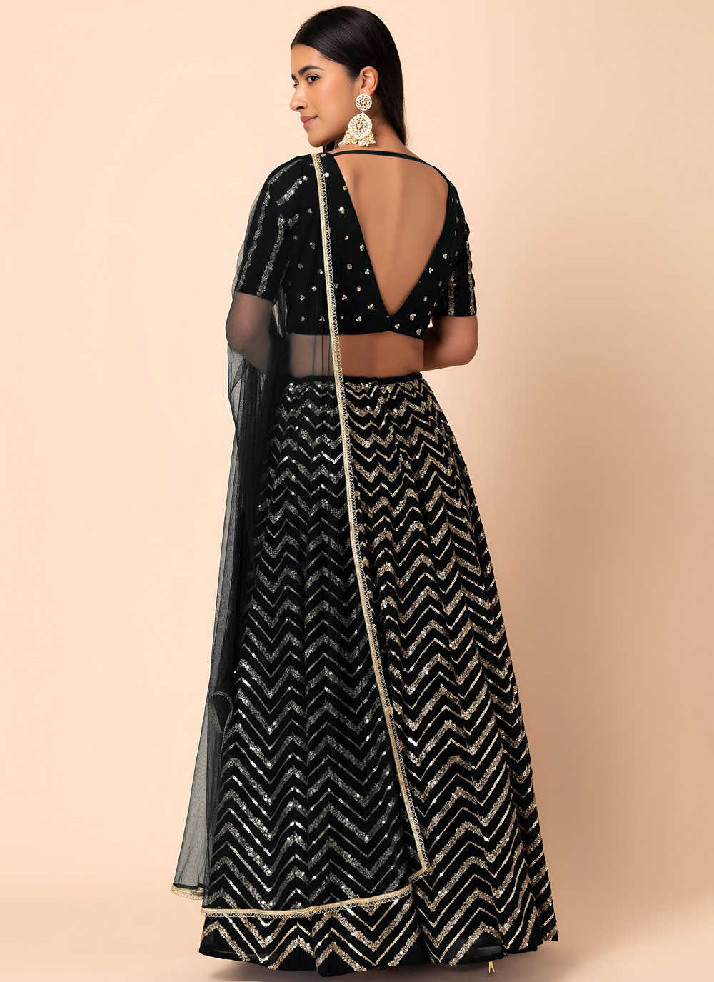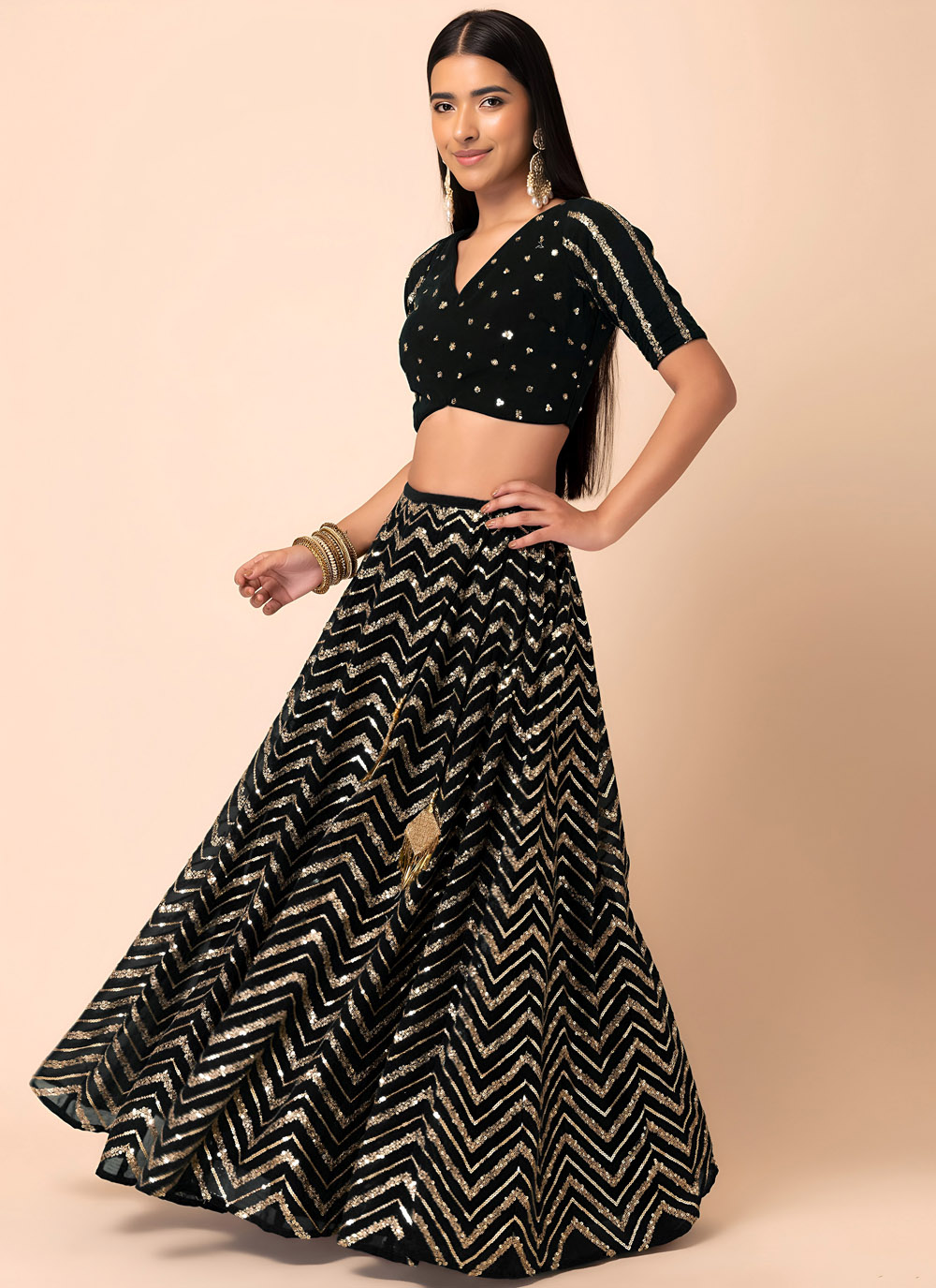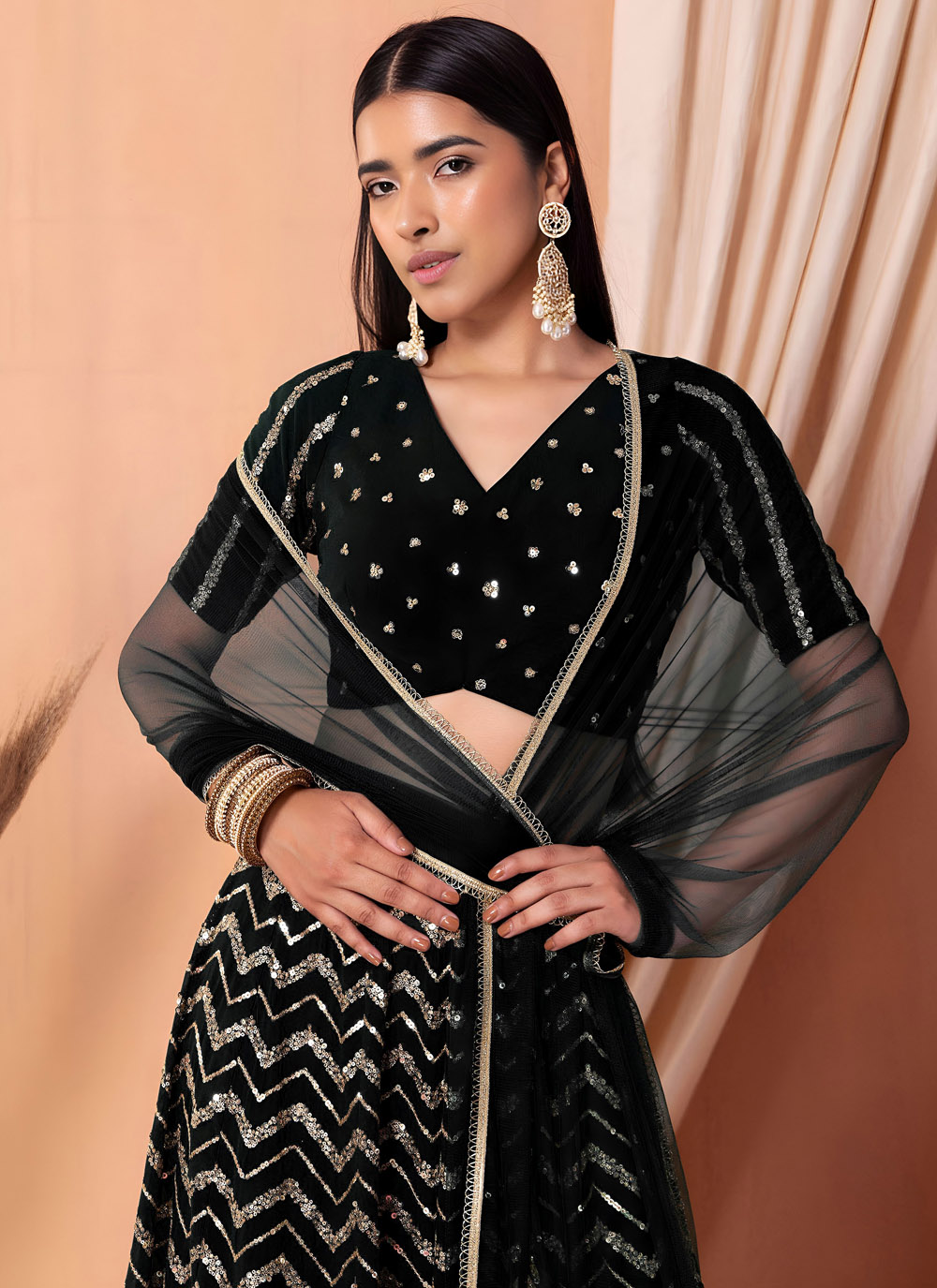 This stunning black lehenga choli showcases elegant georgette fabric paired with intricate zari embroidery and sequin highlights. Comes with matching choli and dupatta.