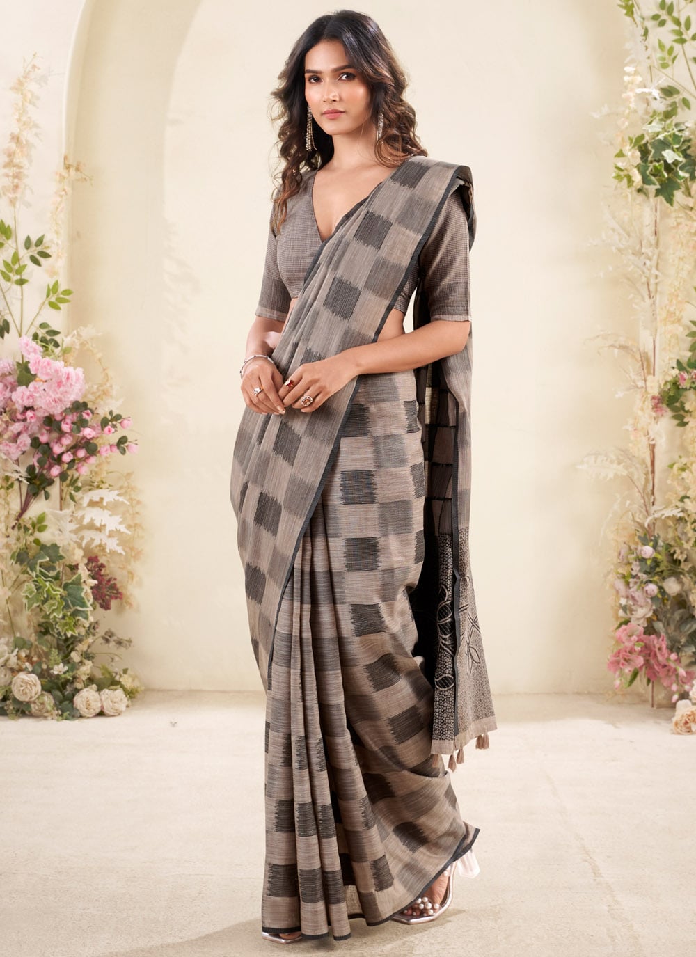 Turn heads in this Classic Black Linen Silk Saree, detailed with elegant woven check patterns. Its lightweight texture and glossy finish ensure comfort with sophistication. Comes with matching blouse.