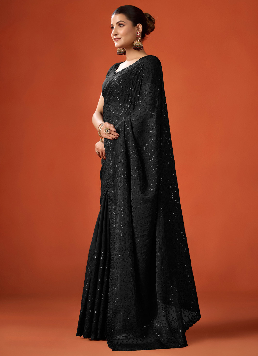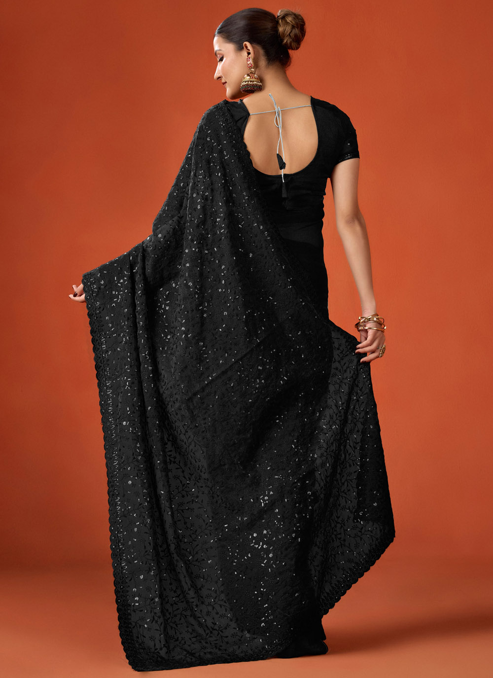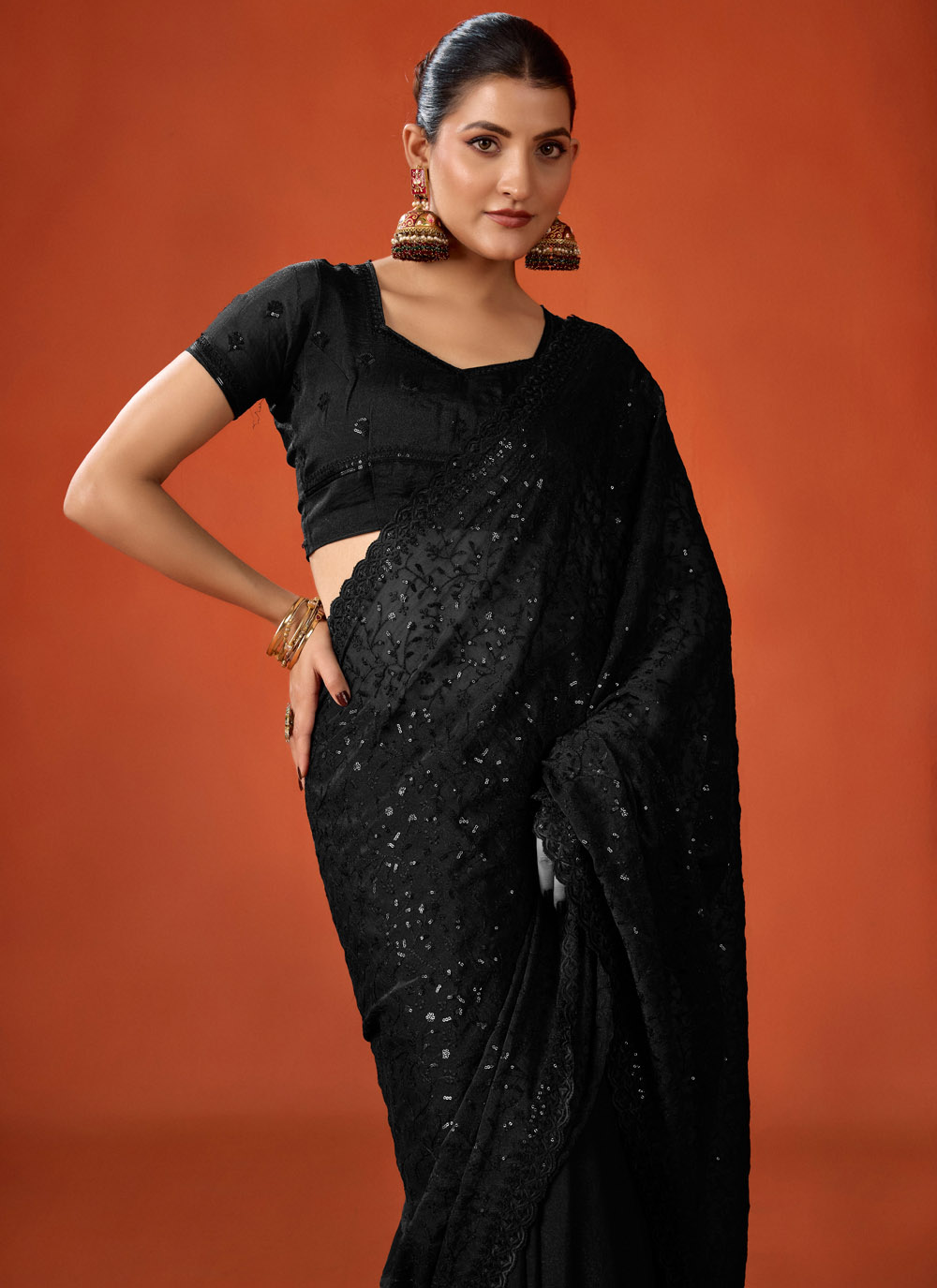 Make a bold fashion statement with this Black Moss Sequins Embroidered Party Trendy Saree. The deep black shade paired with shimmering sequins embroidery creates a glamorous and eye-catching look. Comes with matching blouse.