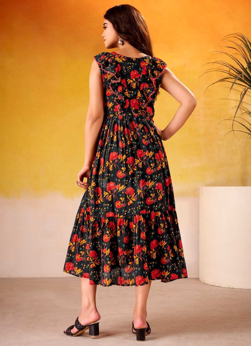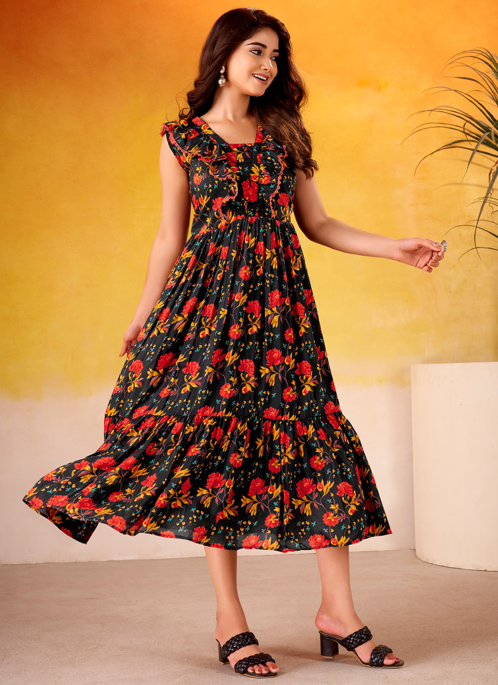 This party-ready kurti showcases beautiful floral patterns on rich black muslin silk fabric. The breathable material and modern design offer a perfect balance of comfort and elegance for stylish occasions.