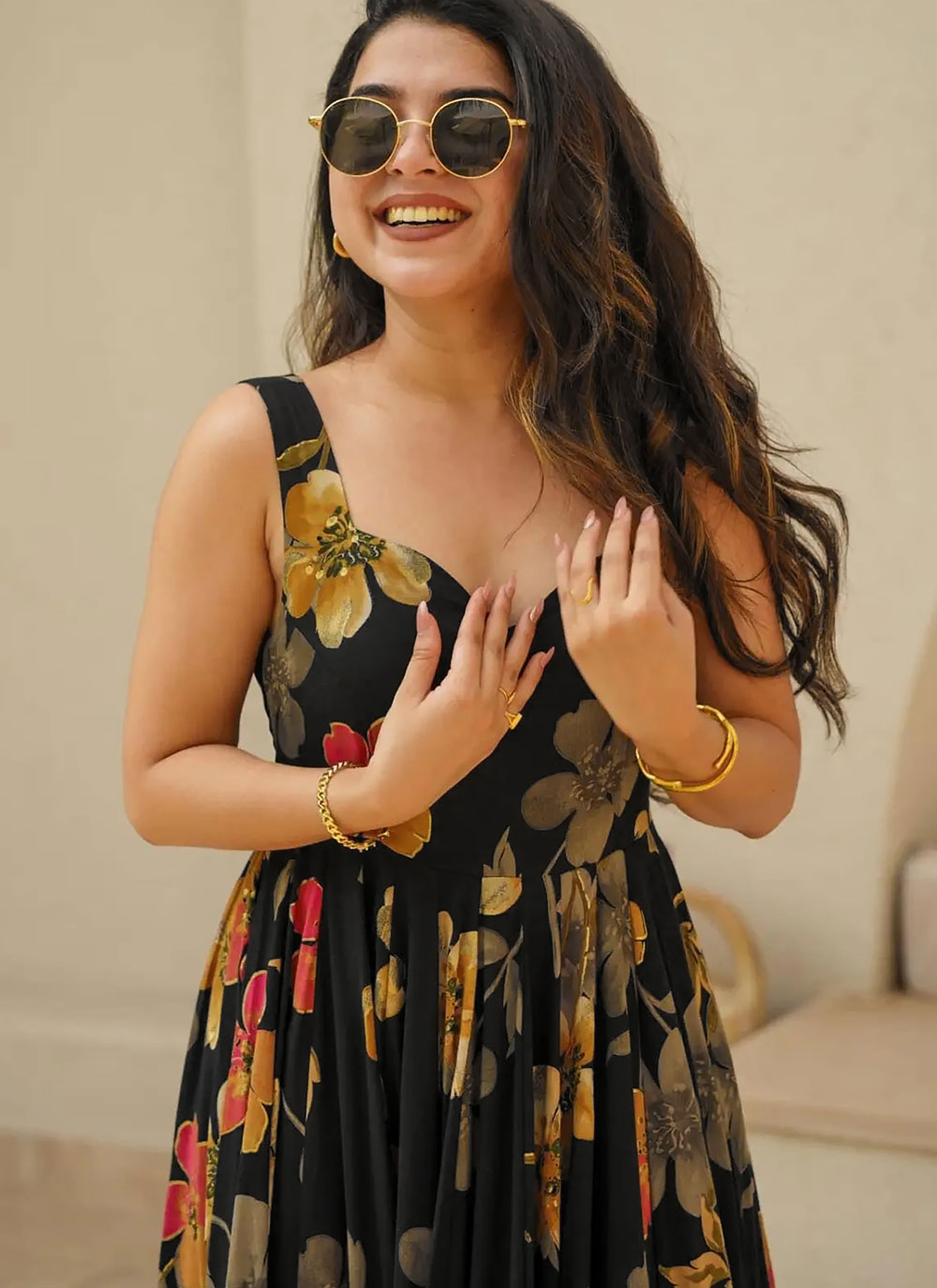 The Black Rayon Digital Print Long Readymade Gown features a chic digital print on soft rayon fabric. Its elegant design and comfortable fit make it perfect for casual or semi-formal occasions, offering a stylish and effortless look.